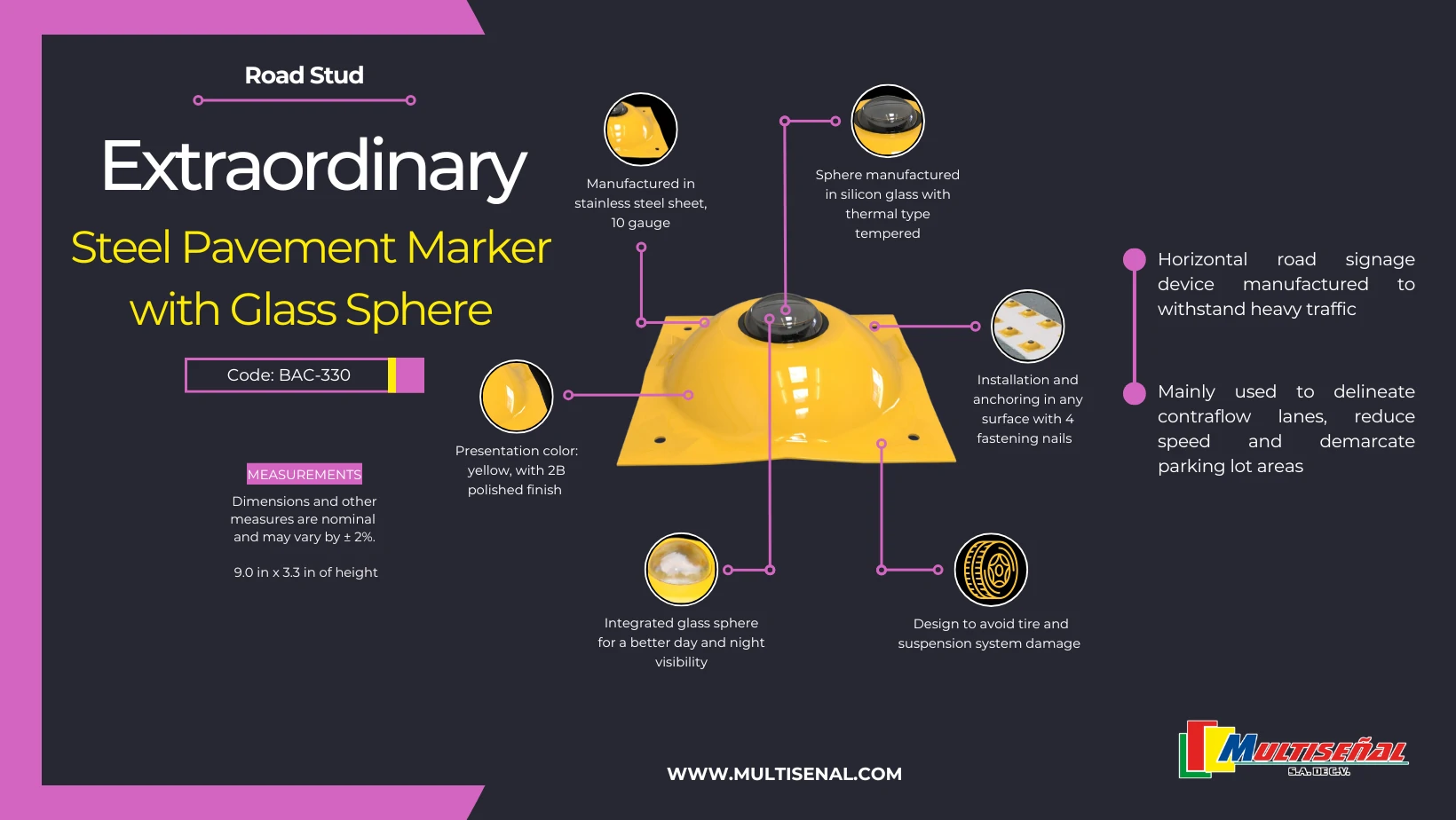 - High Visibility: Thanks to its glass sphere, this Advanced Warning Road Stud guarantees an optimal visibility during day and night, being ideal to delimit contra-flow lanes, speed bumps and parking zones.