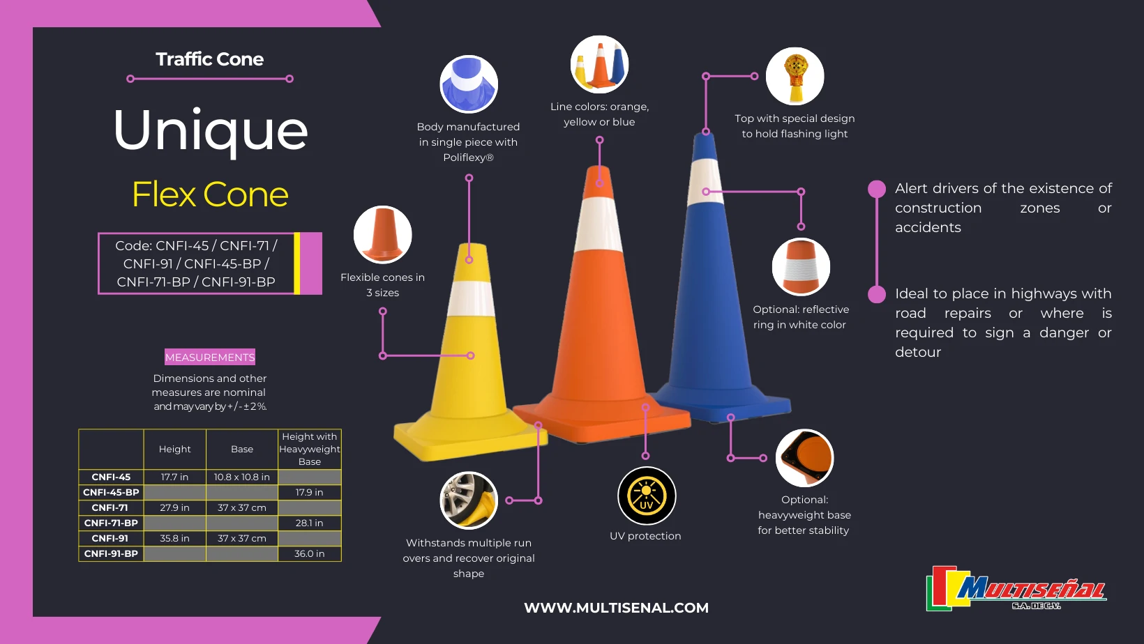 Manufactured in poliflexy, these cones standout for its exceptional resistance, exceeding the conventional PVC cones.