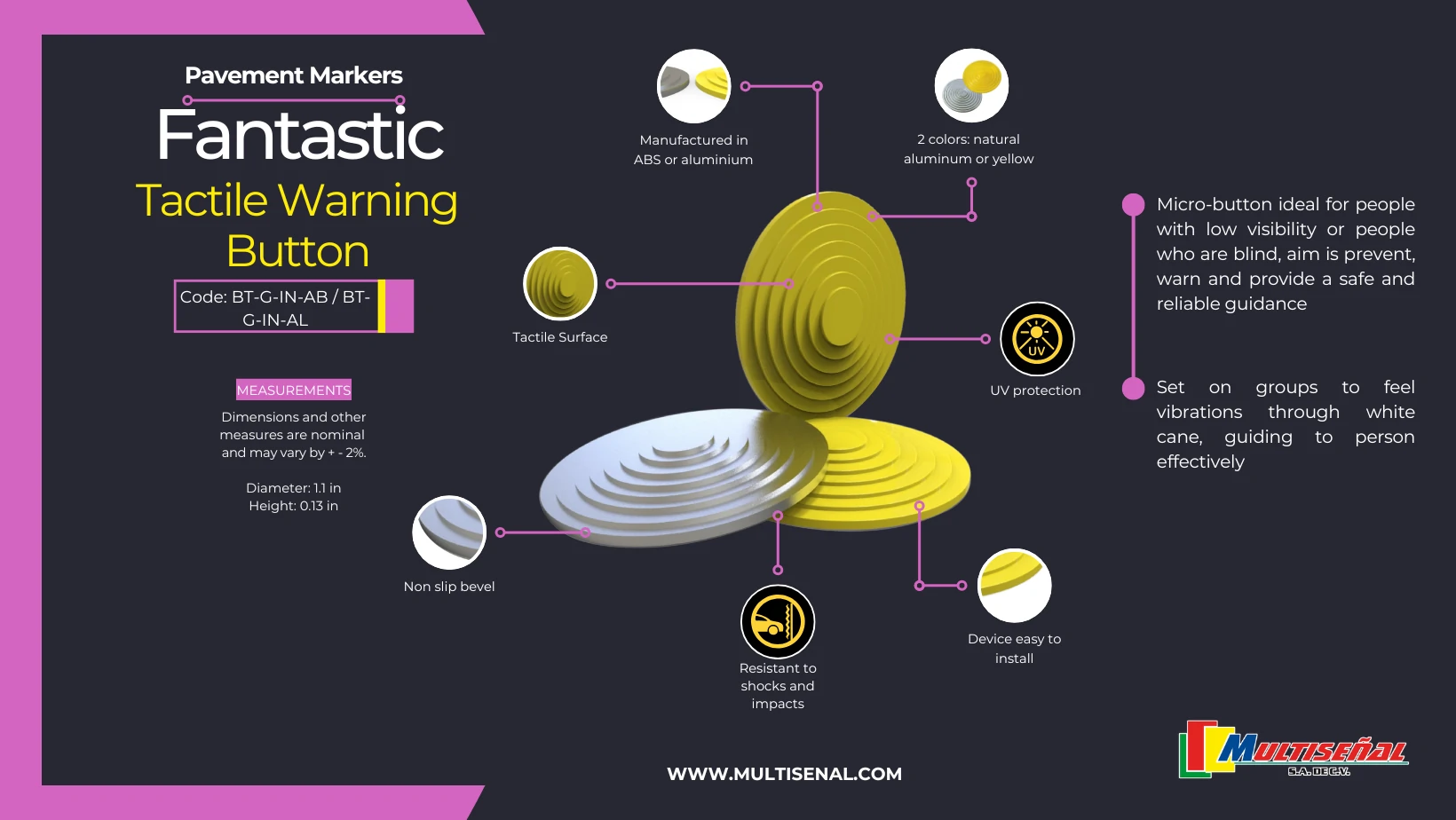 - Versatility: Ideal for pedestrian zones, crossings, intersections, laps, public or private areas, that offer a discrete and effective solution to enhance mobility of people with low vision or who are blind.