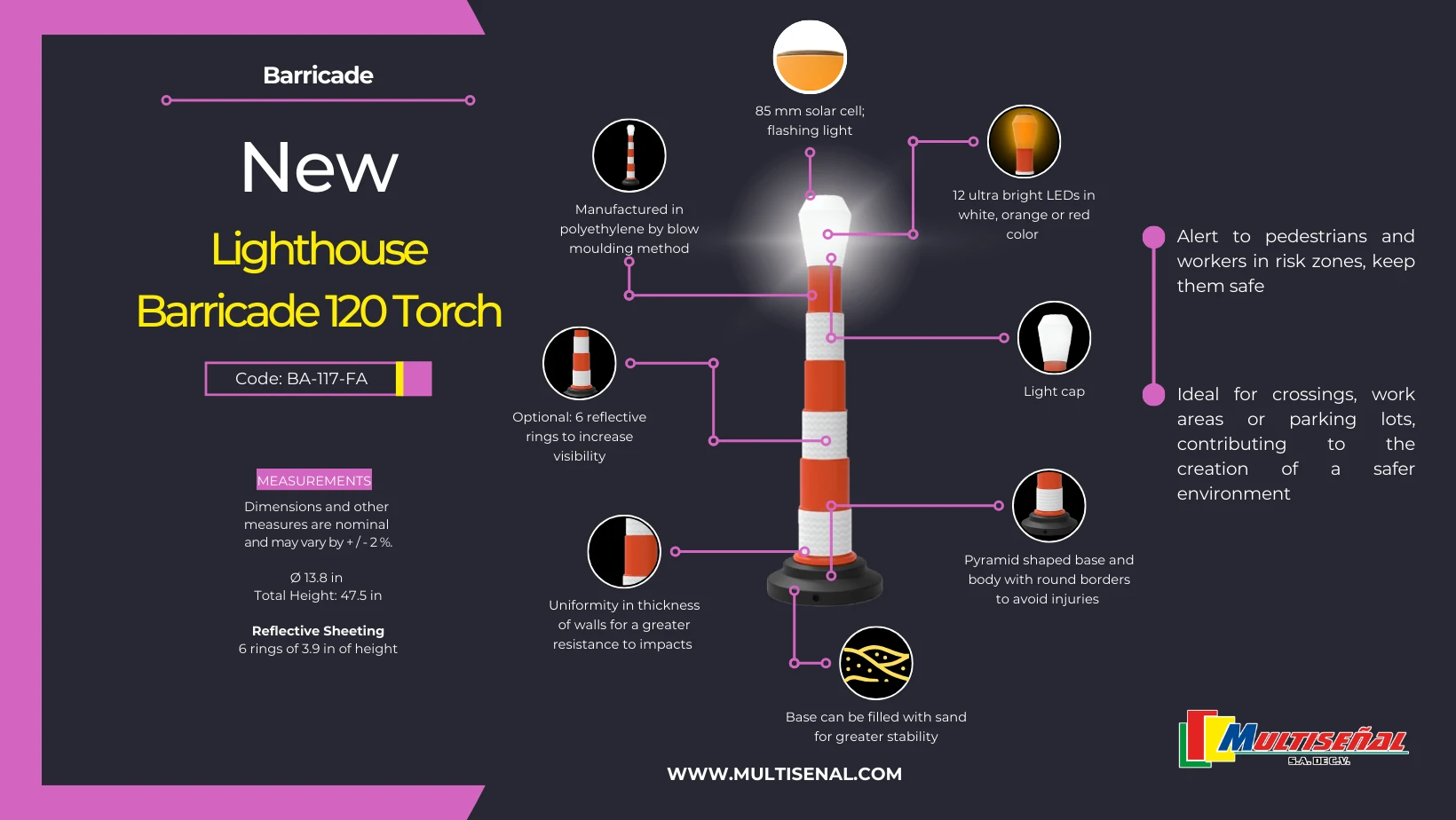 - Versatile Design: With a pyramidal base, the Channelizer Barricade Lights is versatile and considered an efficient tool to delimit, and guarantee safety in construction.