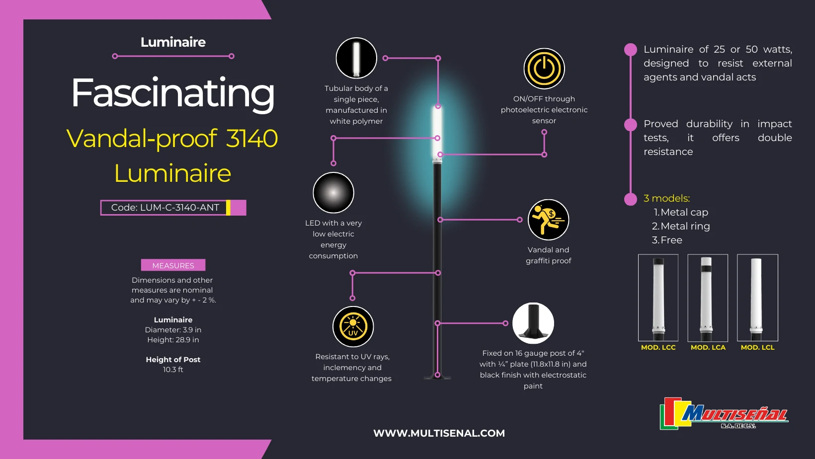 Manufactured in a tubular body of white RCB polymer in a single piece. Stands out for its clean and modern design, in addition, is totally efficient in the light diffusion. This material is extremely resistant, withstanding impacts, UV rays, graffiti and severe climate conditions. A reliable option for areas with high risk of vandalism or constant exposure.