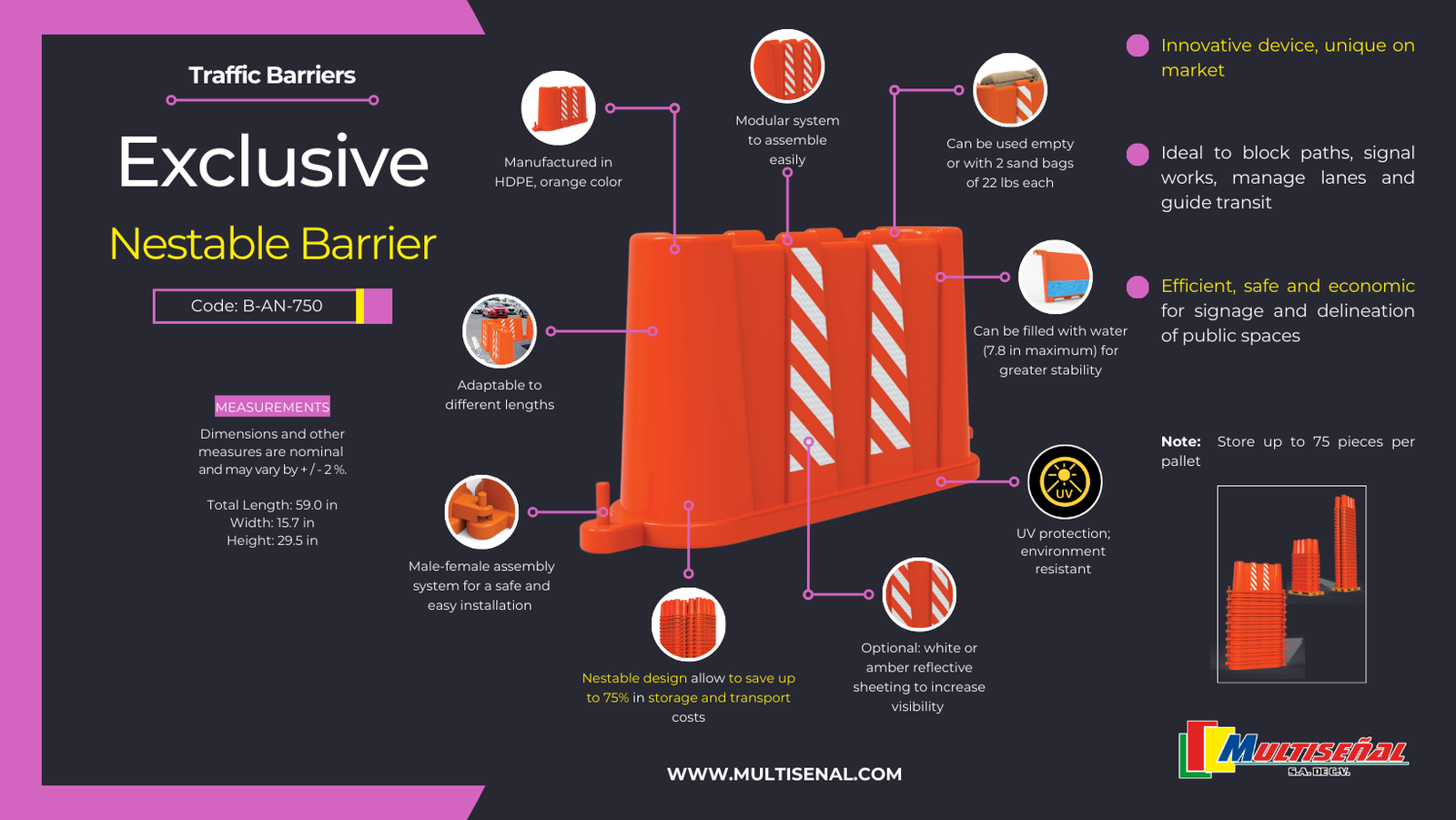 Manufactured in high density polyethylene of orange color, the nestable barrier has UV protection, providing a long lifespan. Designed to resist any climate condition.