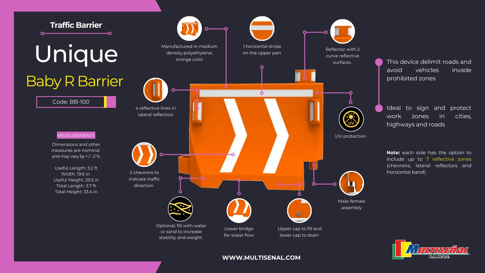 Experience exceptional traffic safety with our Plastic Traffic Barriers by Multiseñal, designed to provide an efficient protection on road projects and traffic areas. This barrier carefully manufactured in the highest quality standards, standing out by its versatility and structural resistance that offers a reliable solution for several usages.
