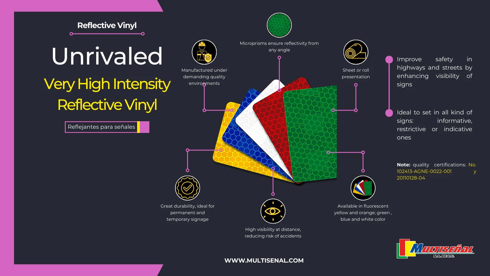 We invite you to explore our broad range of reflective vinyl and choose the one that you like the most, we also have Reflective vinyl of High Visibility, Reflective vinyl of High Visibility Prismatic and Reflective vinyl of Engineer grade.
