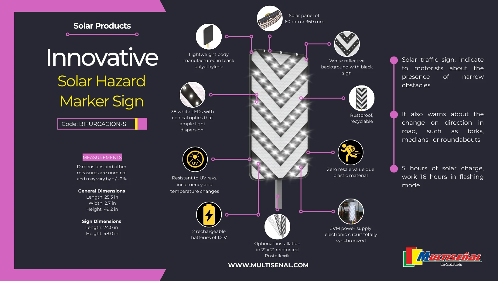 Thanks to solar lighting, sign is visible during day and night, which is essential in low light conditions. This allows motorists to anticipate situations that require greater attention and caution. By receiving a clear advertisement about the presence of obstacles, motorists can adjust their speed and take informed decisions, reducing the risk of collisions.