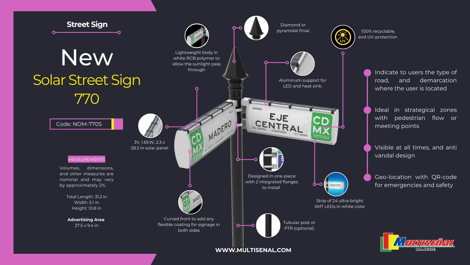 Enrich your urban spaces with the innovative Solar Reflective Street Signs, the perfect fusion between style and usage.