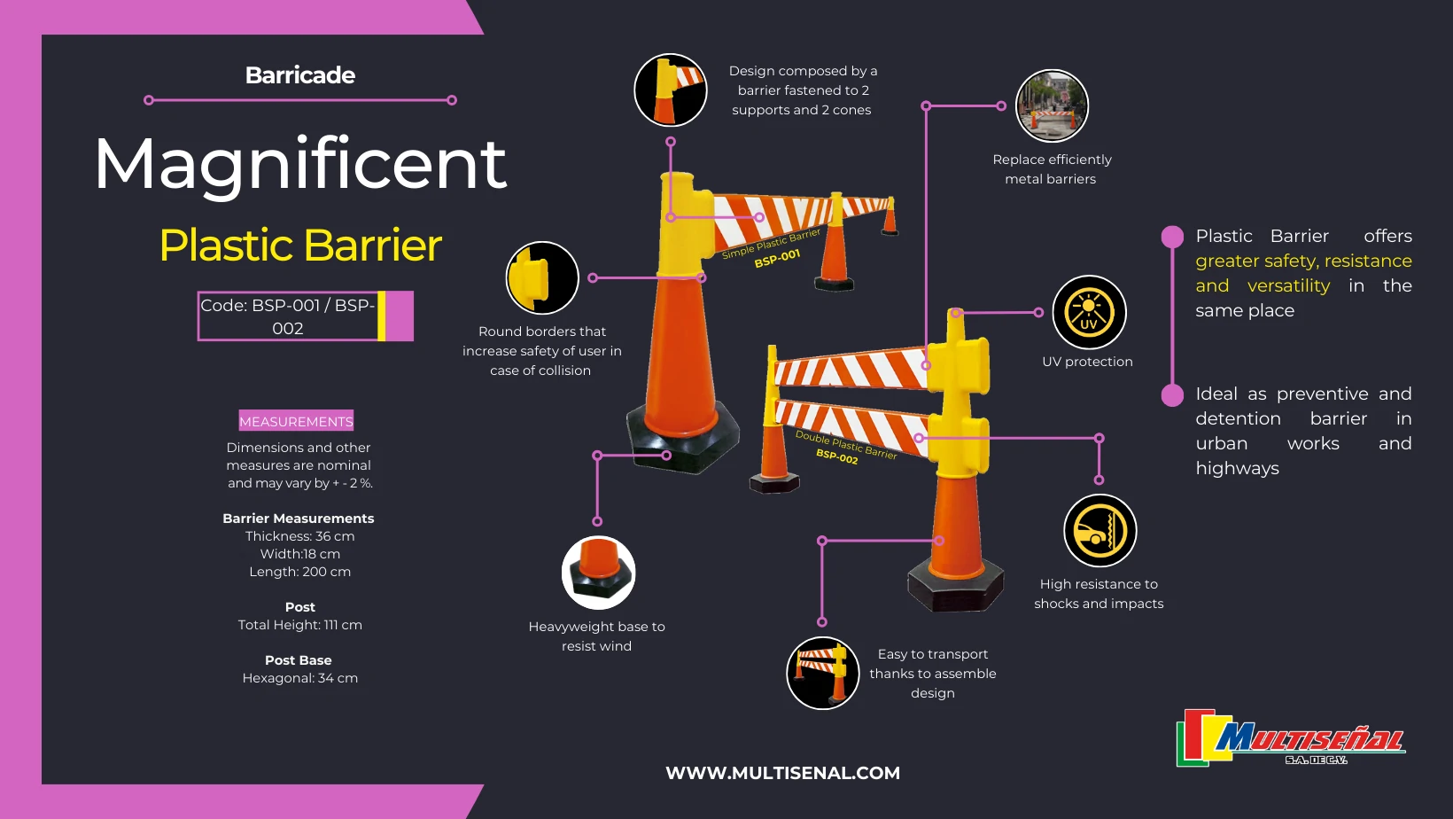 - Driver’s Safety: All the barricade components lacks of cutting edges, guaranteeing driver’s safety if collision.