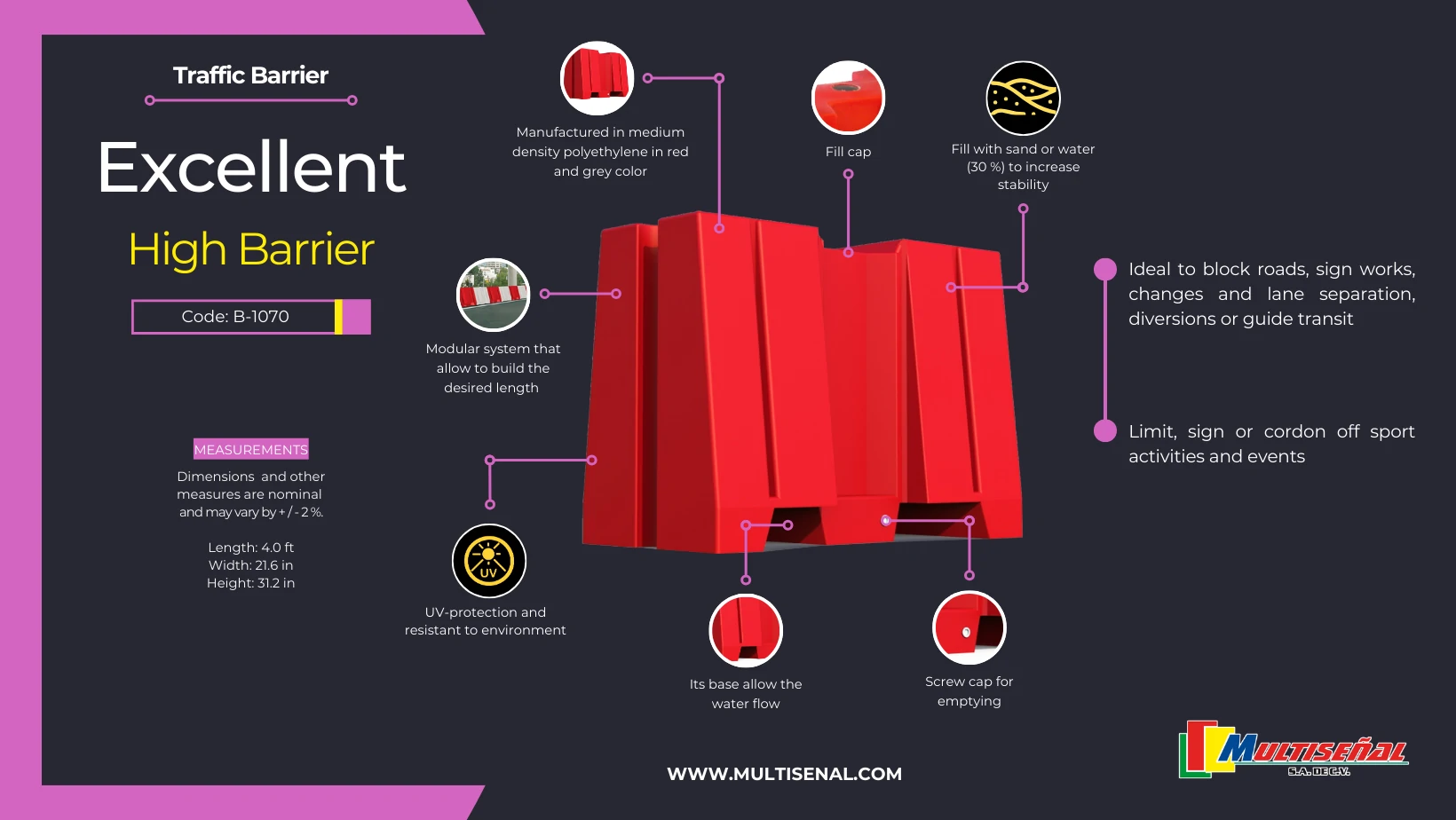 Find these and all kinds of traffic barriers at Multiseñal, where we are manufacturers and exporters of a broad range of signaling and road safety products.
