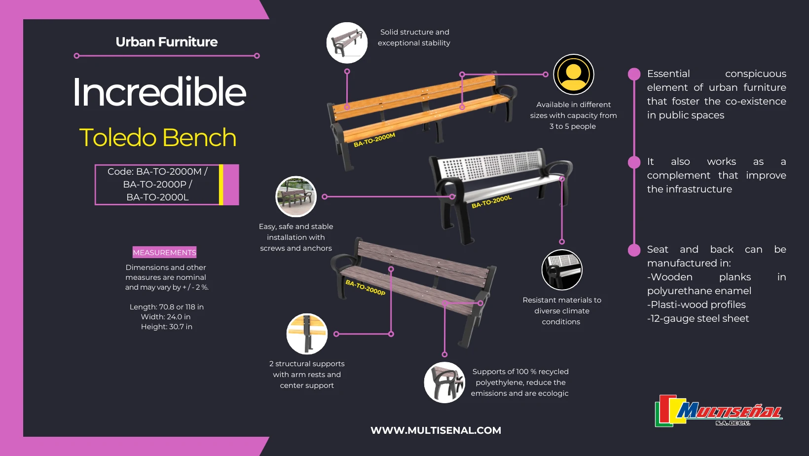 This bench provides structure and resistance, the lateral supports allow people to comfortably sit to improve life quality and promoting the correct use of public spaces.