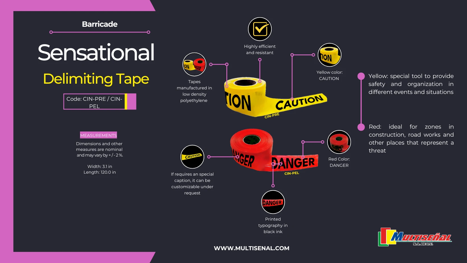 2. Versatile Usage: Its main use consists in mark Danger or Caution zones in road or construction projects. This tape is an effective tool to sign areas where attention is crucial, contributing to workplace safety.