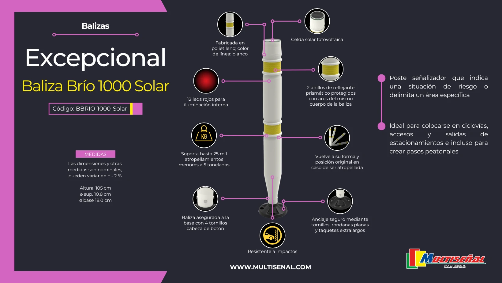 - Resistente al impacto vehicular, regresando a su posición original tras colisiones.