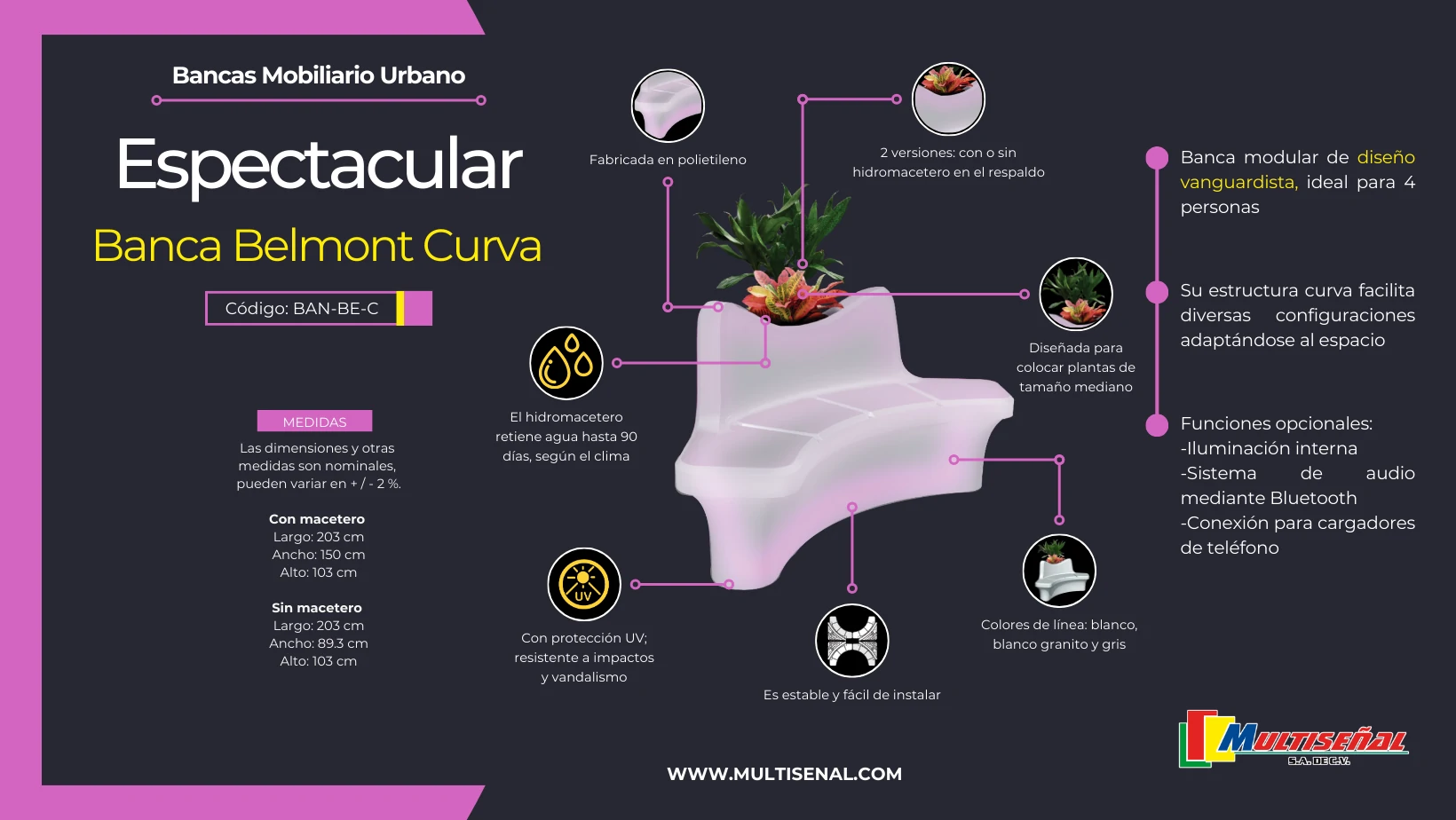 La innovadora banca Belmont curva con hidromacetero redefine el concepto de mobiliario modular con su diseño vanguardista, especialmente creado para acomodar a 4 personas de manera cómoda y elegante.