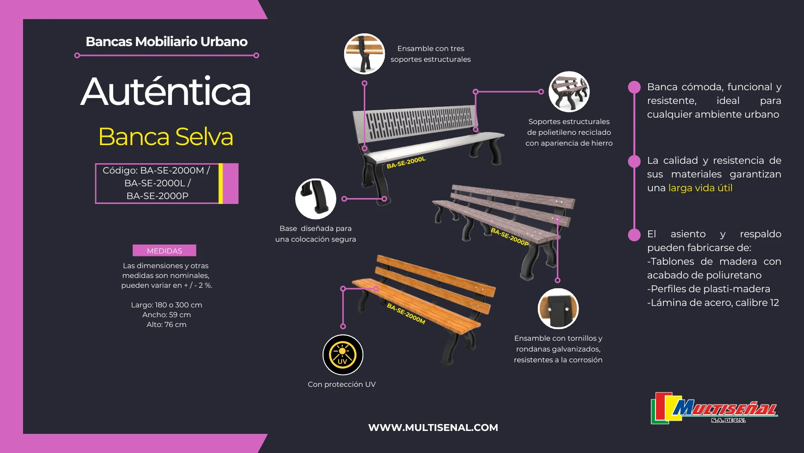 La combinación de soportes estructurales de polietileno reciclado con apariencia de hierro colado, junto con asientos y respaldos de madera, resulta en bancas cómodas, funcionales y robustas.