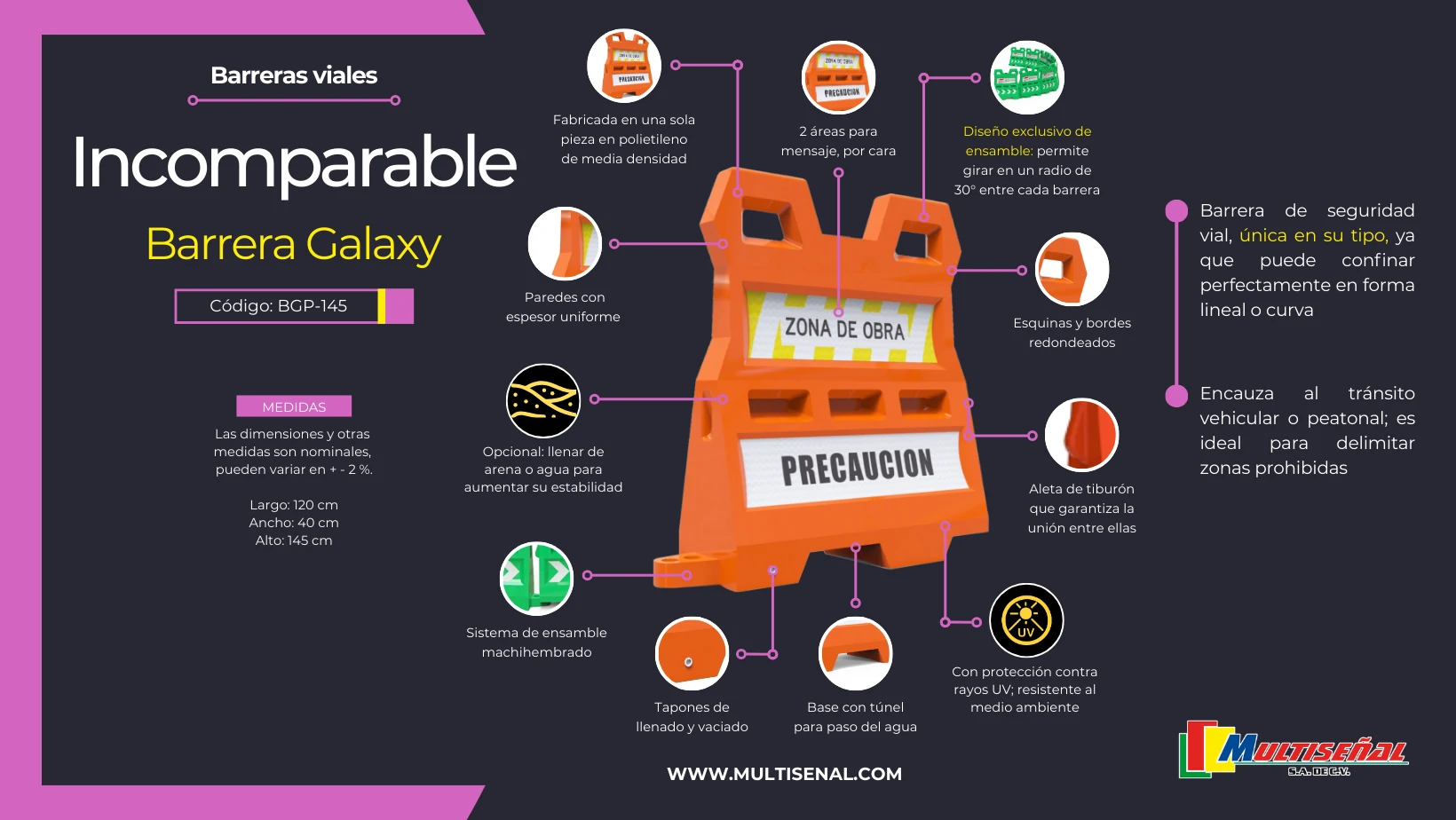 Introducida en los entornos de construcción y en las instalaciones de señalización de fábricas, la barrera de protección vial, también conocida como Barrera Galaxy, redefine los estándares de protección en espacios industriales.