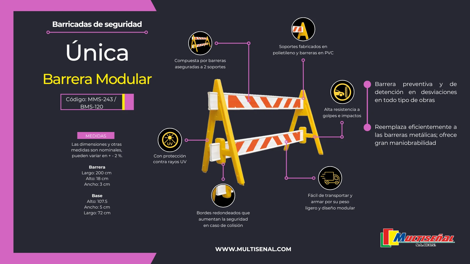 Te invitamos a conocer más de nuestros excelentes productos viales como la barrera modular doble MMS-243, con un excelente desempeño. Recuerda que somos fabricantes y distribuidores de nuestros productos.