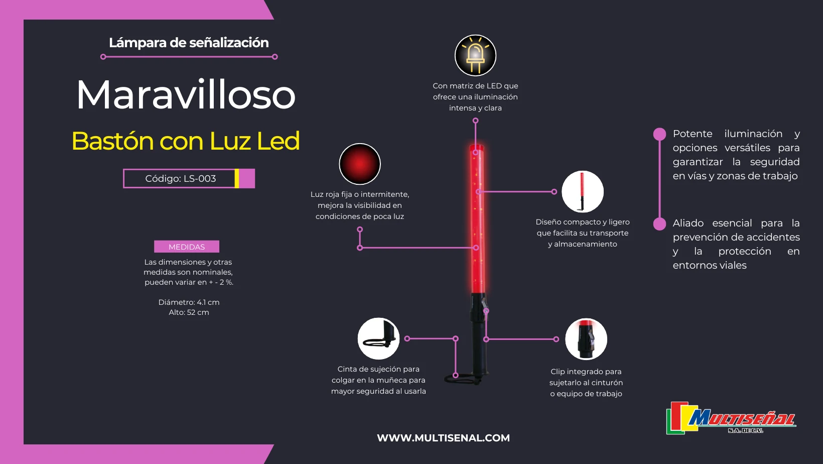 - Visibilidad Óptima: Los LEDs de alta intensidad aseguran una visibilidad óptima, incluso en condiciones de baja luminosidad. Este bastón no solo cumple su función de advertencia, sino que también contribuye a la seguridad global en el entorno de trabajo.