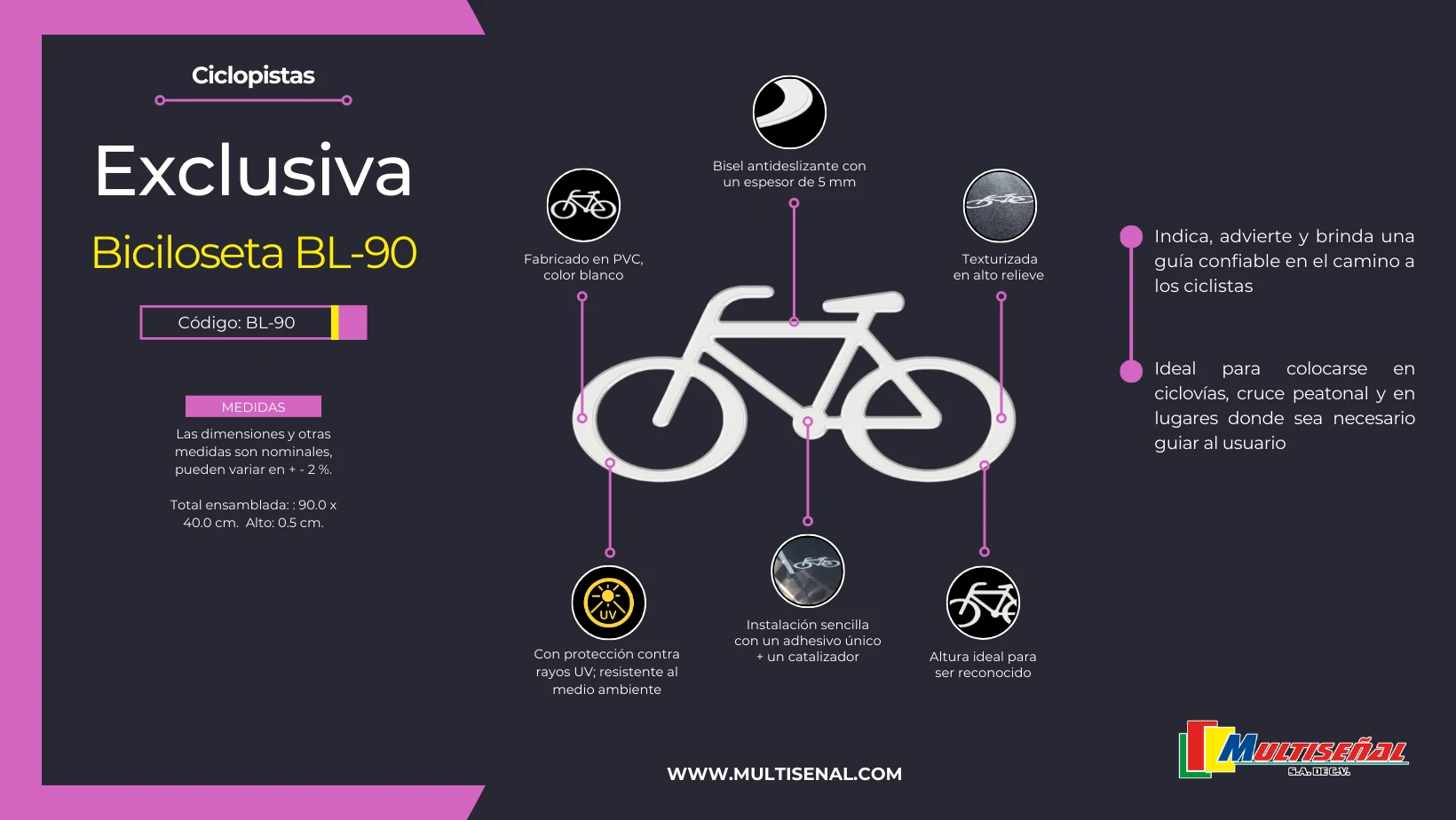 Esta Biciloseta BL-90 es la opción ideal para ciclovías, cruces peatonales y cualquier lugar donde sea necesario guiar a los usuarios de manera efectiva y segura. Invierte en la seguridad vial con un producto confiable y de calidad superior.