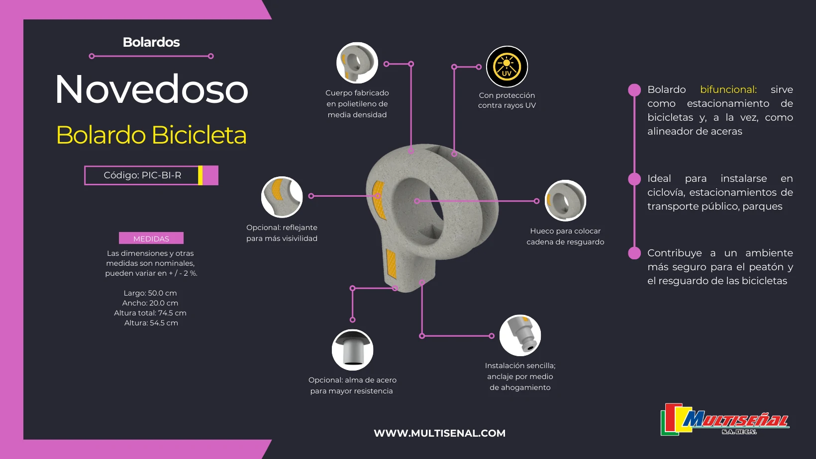 Además de cumplir con eficacia su rol como alineador urbano, sirve como una opción de estacionamiento para bicicletas, al tiempo que actúa como delimitante vial de seguridad, impidiendo el acceso no autorizado de vehículos.