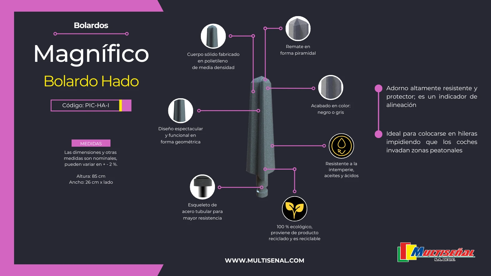 El Bolardo Hado es una opción confiable, sostenible y de bajo mantenimiento, ideal para delimitar y proteger espacios de manera eficiente. Combina funcionalidad, resistencia y diseño, siendo la elección perfecta para entornos que priorizan la seguridad y el cuidado del medio ambiente.