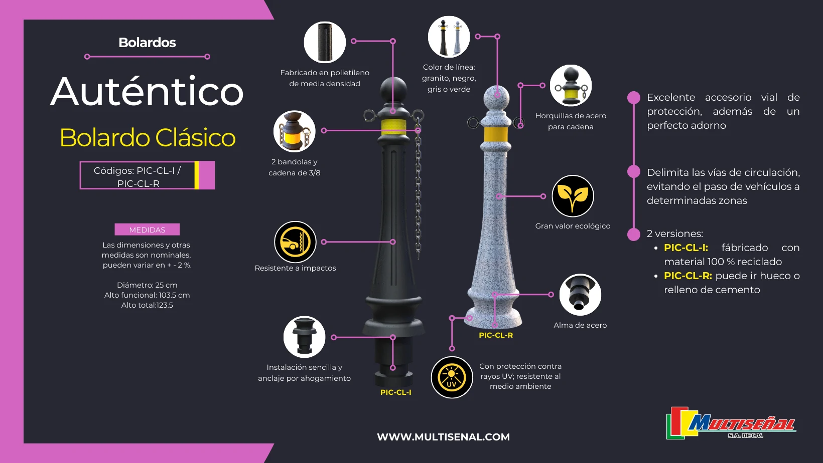 - Opciones variadas: Desde el PIC-OB-I, con un 100% de material reciclado y alma de acero, hasta el PIC-OB-R, que puede rellenarse con cemento, ofrecemos variedad de opciones en colores como negro, gris, granito y verde.