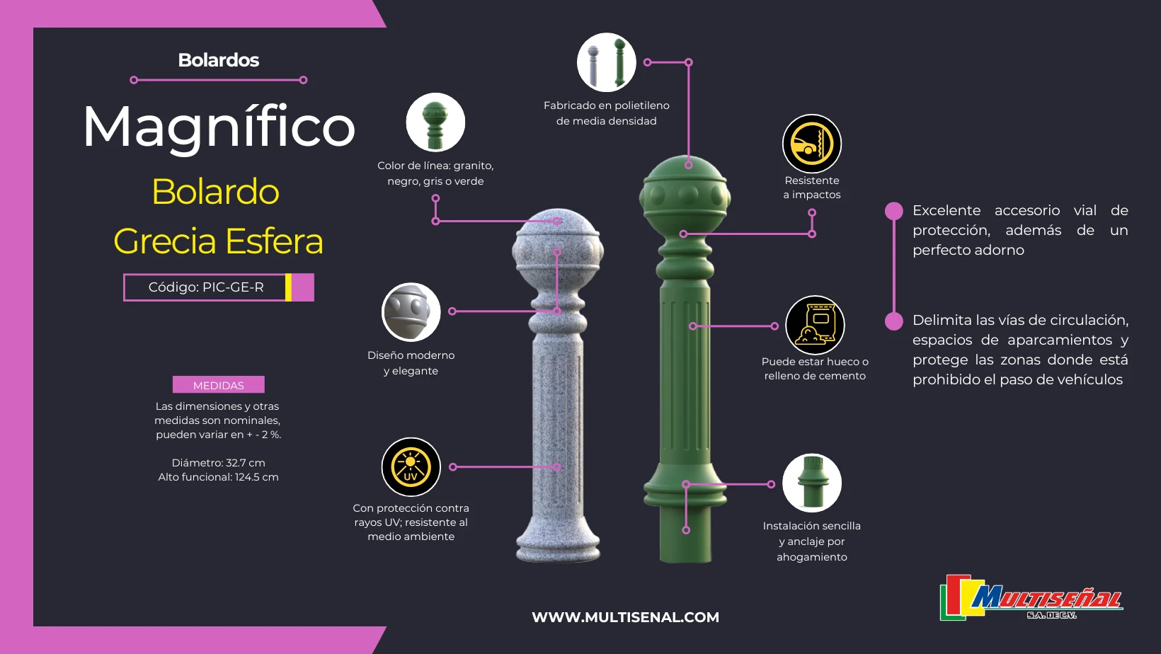 - Estética Moderna: La Picoba decorativa de nuestros modelos PIC-GE-R y PIC-GC-R combina elegancia y eficacia, convirtiéndola en un accesorio vial de gran impacto visual.