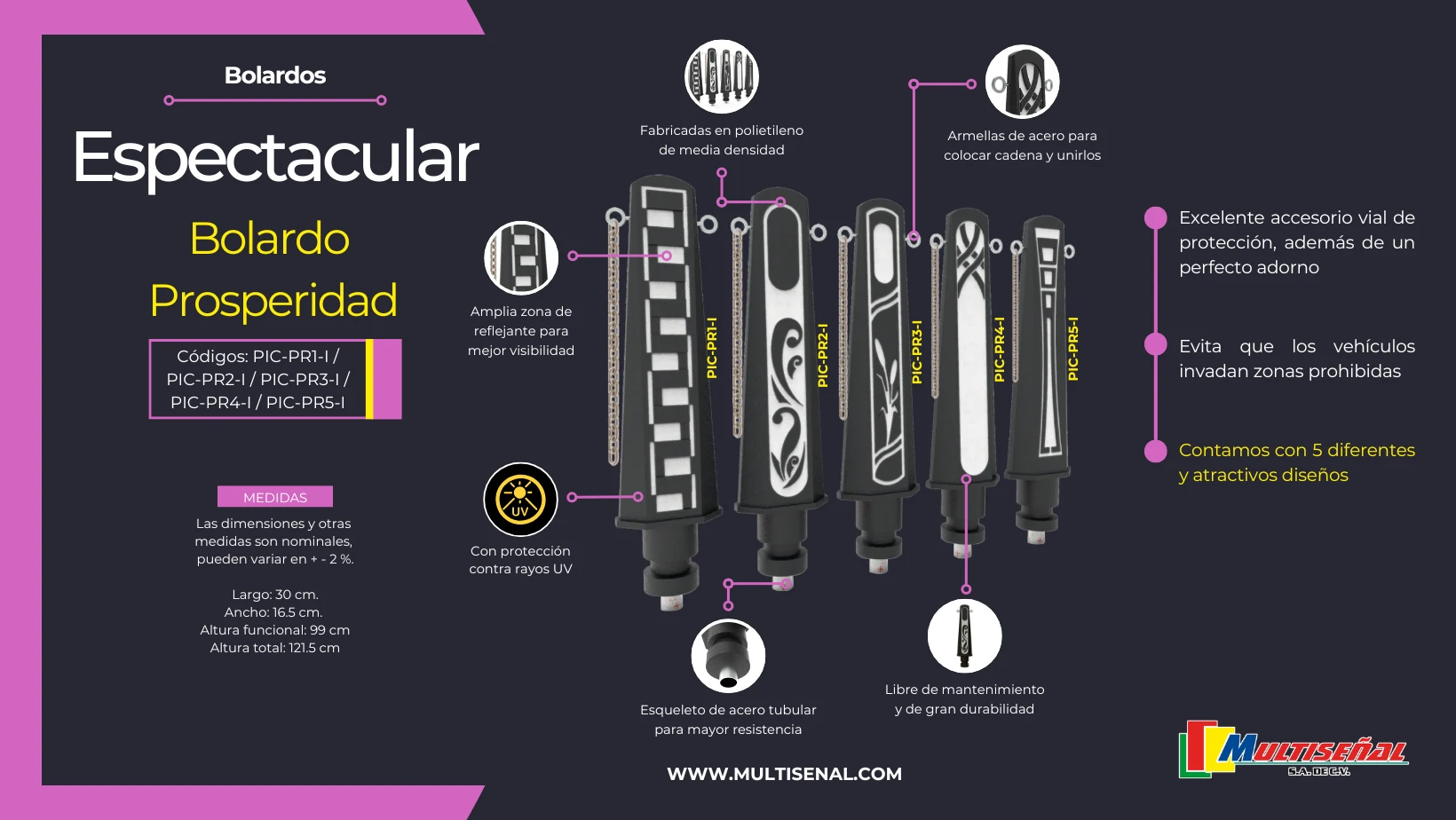 Dotados de diseños distintivos y equipados con reflejantes que mejoran la visibilidad, estos postes se destacan como guardianes incansables del camino.
