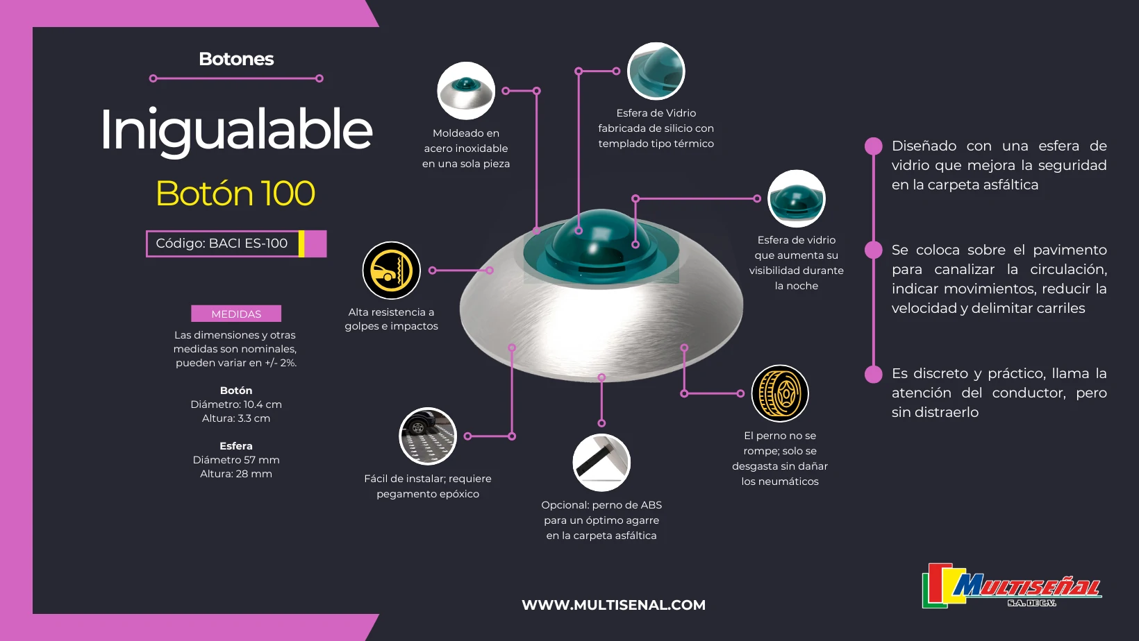 - Versatilidad en aplicación: Ideal para confinar y delimitar carriles en todo tipo de caminos, el Botón 100 se destaca por su versatilidad. Su capacidad para canalizar la circulación, indicar movimientos y alertar a los conductores sin distraerlos lo convierte en una herramienta útil y práctica.