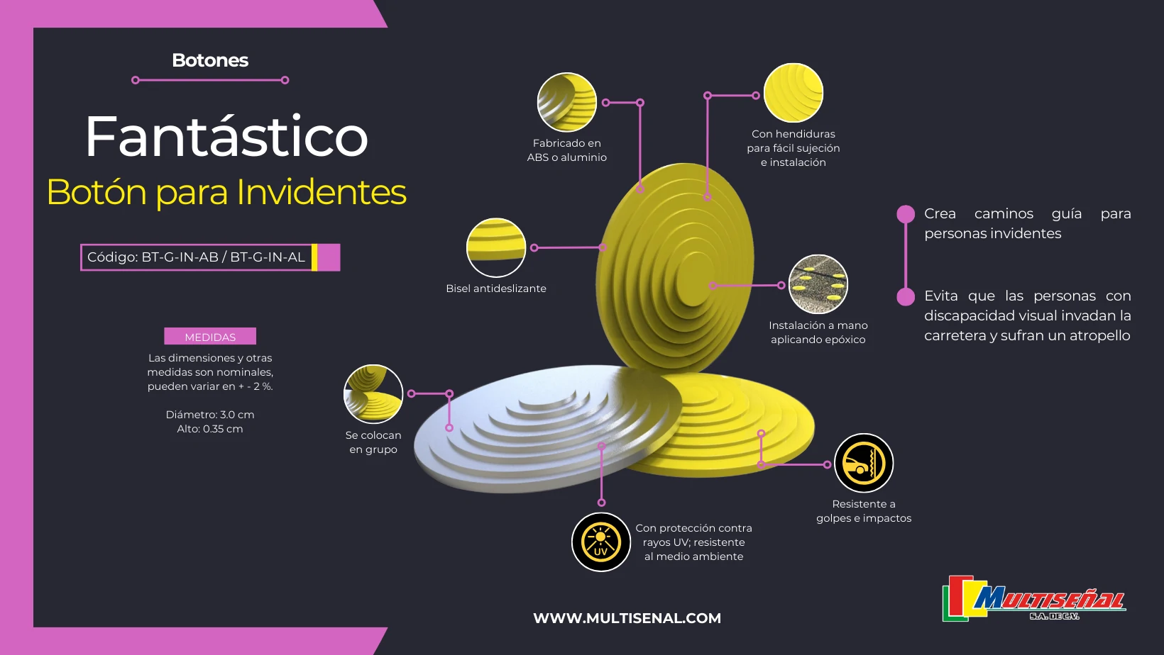- Instalación Sencilla: Equipados con muescas para facilitar el manejo e instalación, estos botones guía son una adición práctica y funcional para entornos urbanos inclusivos.