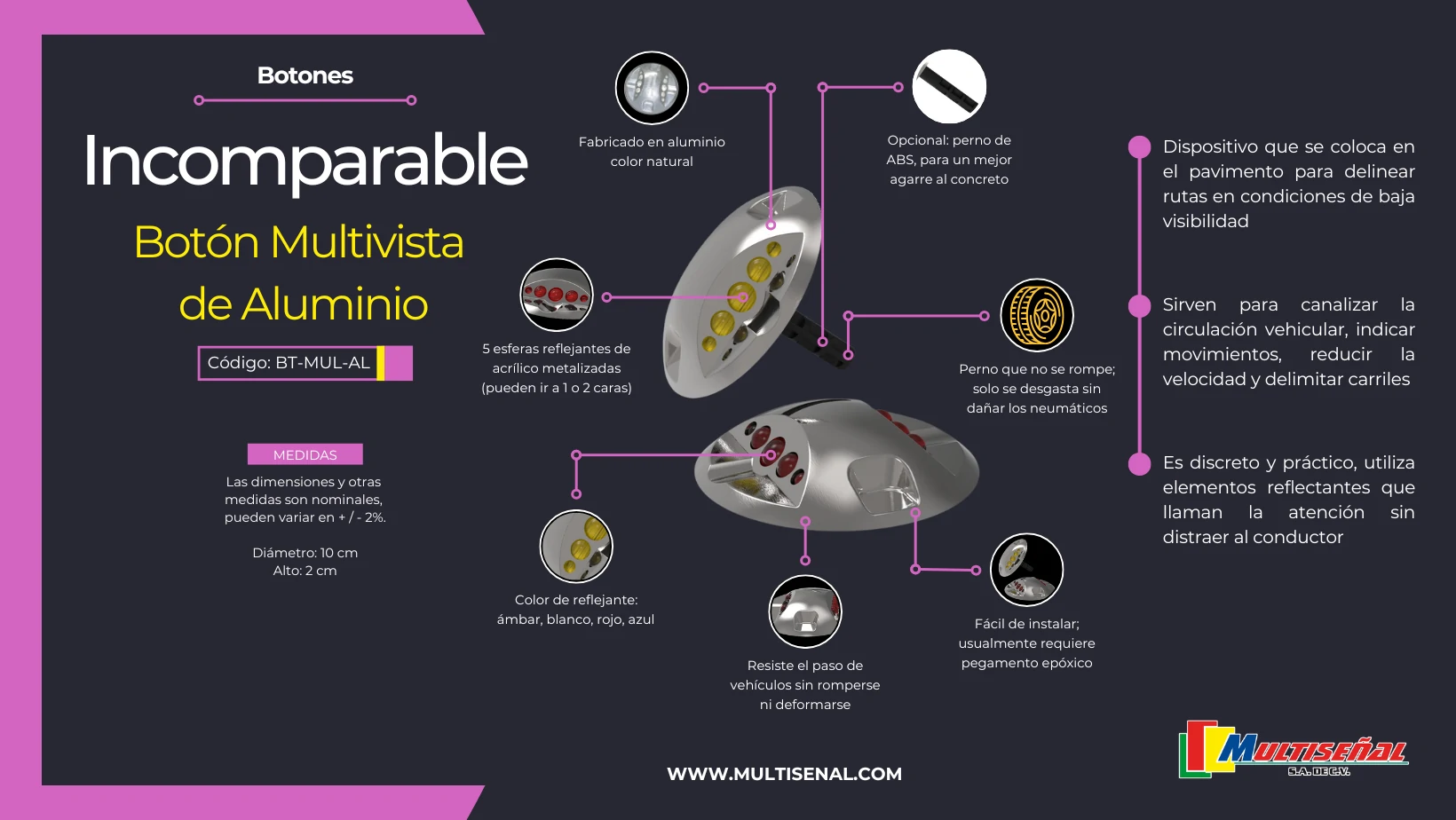 - Alta resistencia: Resistente al desgaste, la fricción, el peso, la humedad y la lluvia, nuestro botón Multivista Aluminio garantiza un rendimiento confiable en diversas condiciones climáticas y de tráfico.