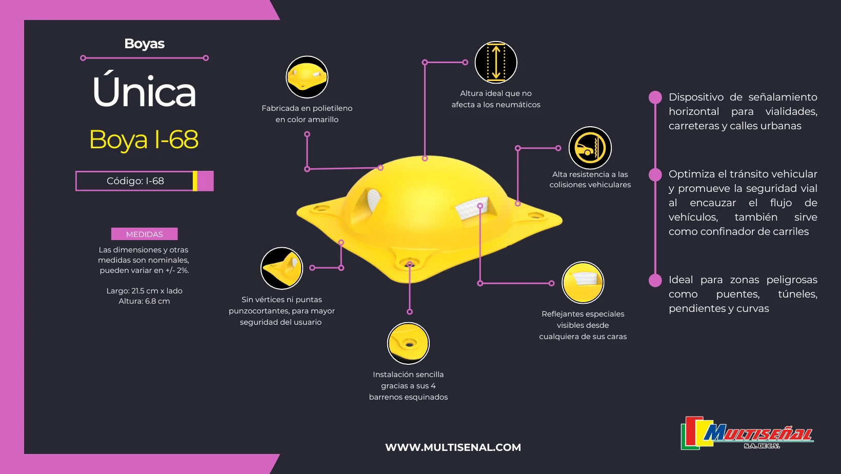 Centrada en la seguridad vial y el flujo vehicular, la boya I-68 emerge como esencial en entornos peligrosos como puentes, túneles, pendientes y curvas.