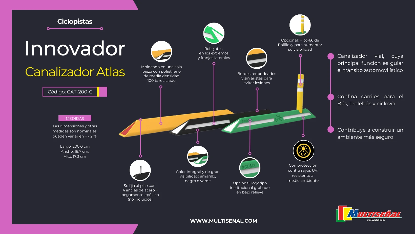 Experimenta una gestión eficiente del tráfico automovilístico con nuestro canalizador atlas, un reductor de velocidad o bolardo confinador de carriles diseñado para sistemas de Bus, Trolebús y ciclovías. Este dispositivo, moldeado en una sola pieza con polietileno de media densidad 100 % reciclado, no solo promueve la sostenibilidad, sino que también garantiza una durabilidad excepcional.