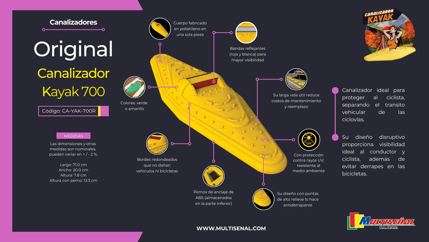 El Canalizador Kayak Reflejante ofrece una solución completa para delimitar carriles y proteger a todos los usuarios de la vía. Fabricado con materiales de alta calidad y diseñado para resistir cualquier condición climática, es la elección perfecta para garantizar un tránsito seguro y fluido.