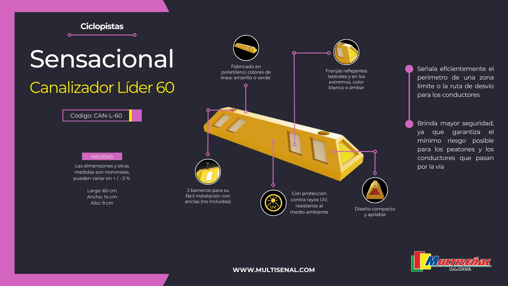 - Fabricación en polietileno de alta calidad: El Canalizador Líder 60 está fabricado con polietileno de primera calidad, un material que garantiza resistencia y durabilidad sin causar daño alguno a los vehículos que circulan sobre él.
