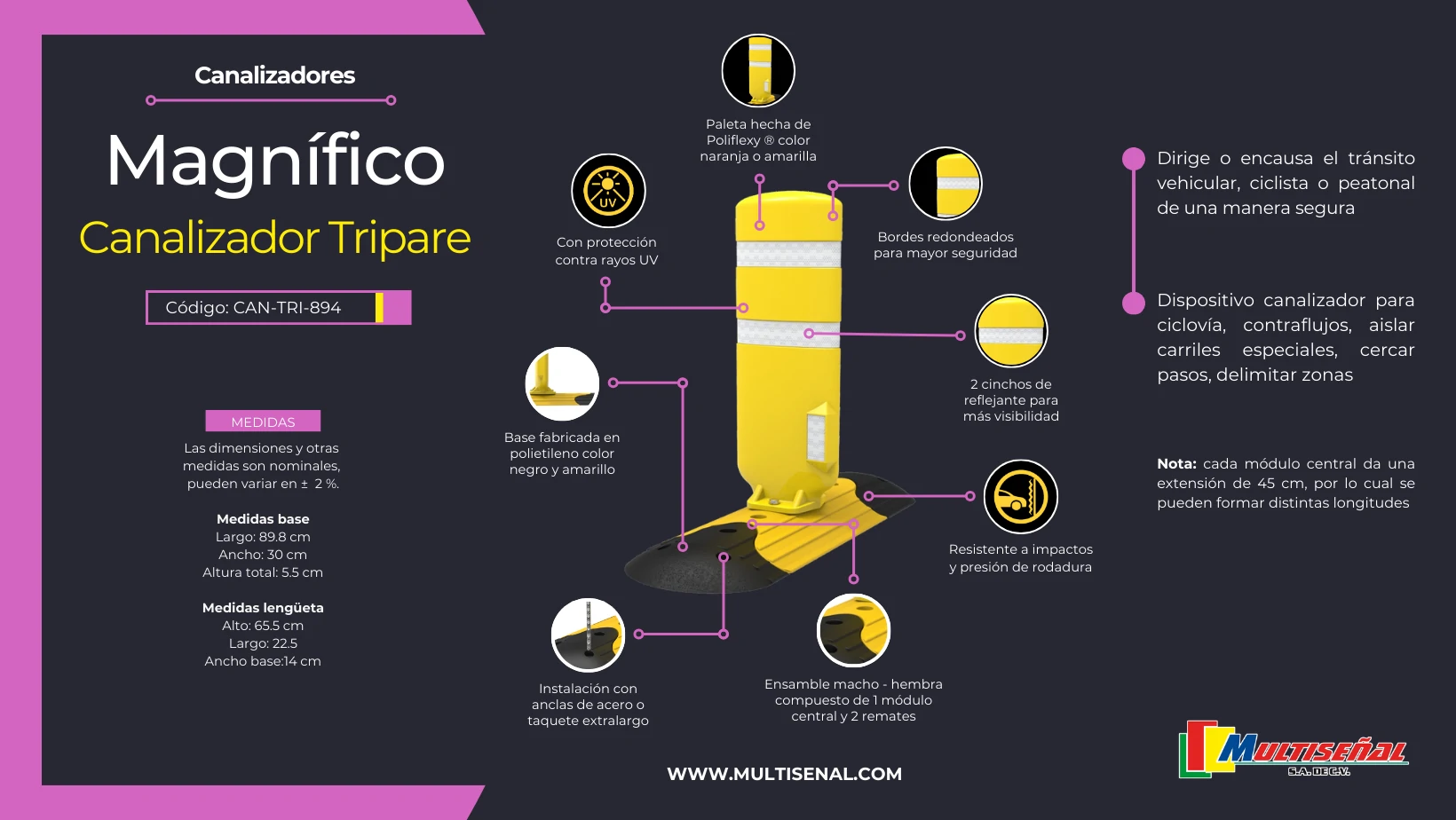 Descubre el canalizador tripare, un dispositivo innovador diseñado para dirigir y encauzar el tráfico vehicular, ciclista o peatonal de manera segura, promoviendo así la seguridad vial en diversas situaciones.
