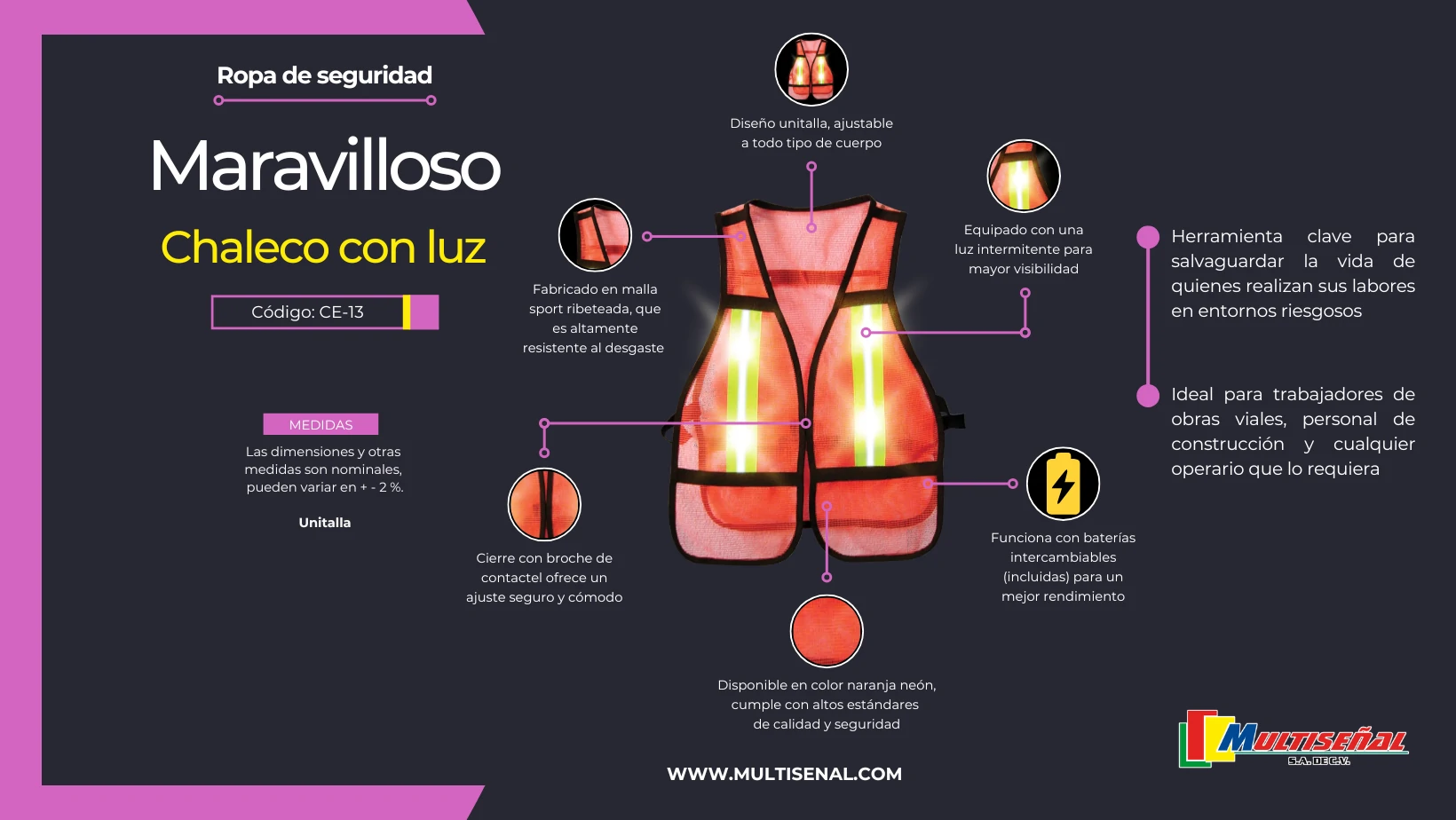 El chaleco con luz es un accesorio de seguridad esencial para los trabajadores que realizan labores viales nocturnas. Actualmente contamos con diferentes productos para las albores viales o de construcción como el chaleco de malla y el chaleco poliéster.