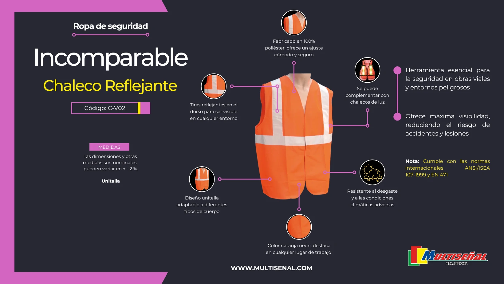- Cumple con estándares internacionales de seguridad, ANSI/ISEA 107-1999 y EN 471.
