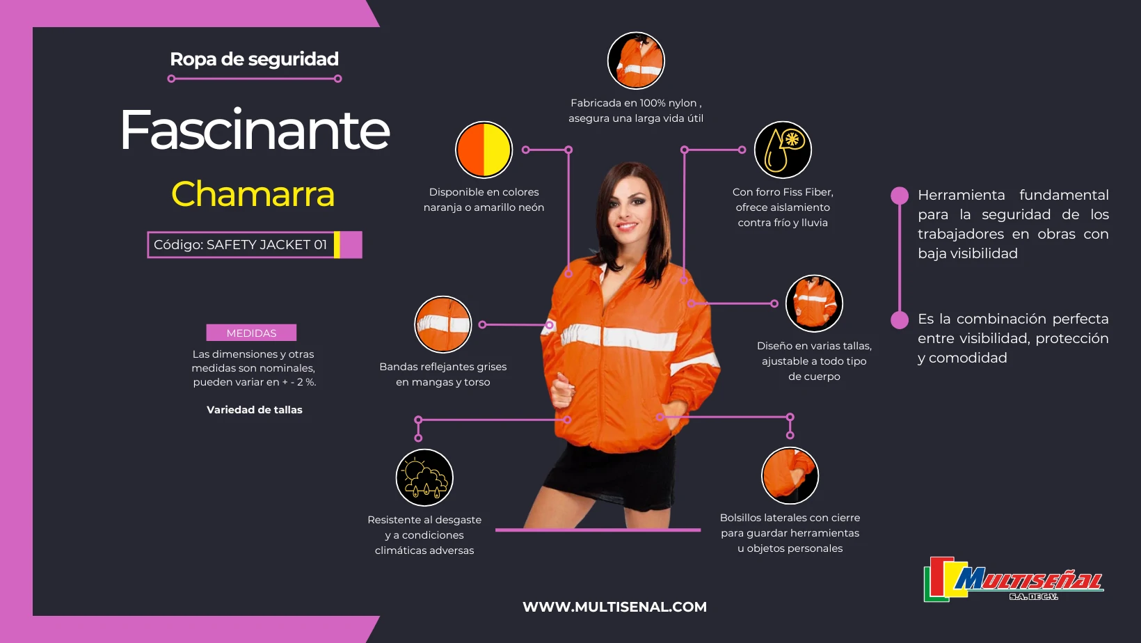 - Visibilidad: la chamarra es altamente visible, lo que ayuda a prevenir accidentes.