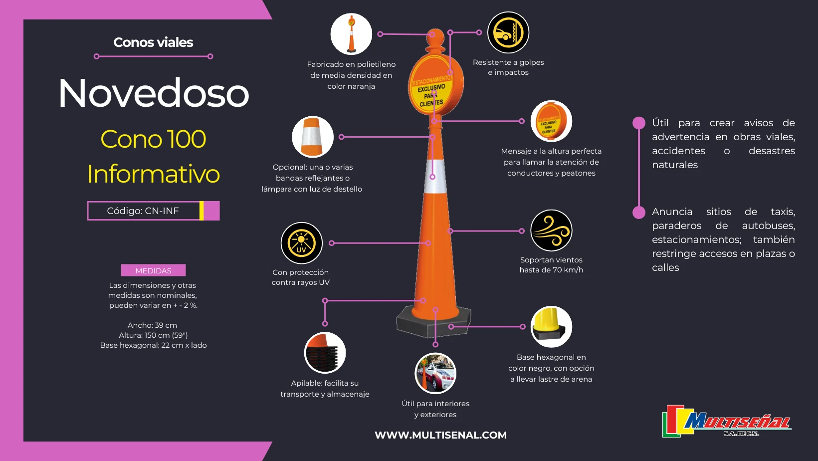 - Amplia superficie para mensajes: El cono informativo 100 ofrece un área destacada para mensajes, ya sea para advertencias, publicidad de productos o campañas informativas.