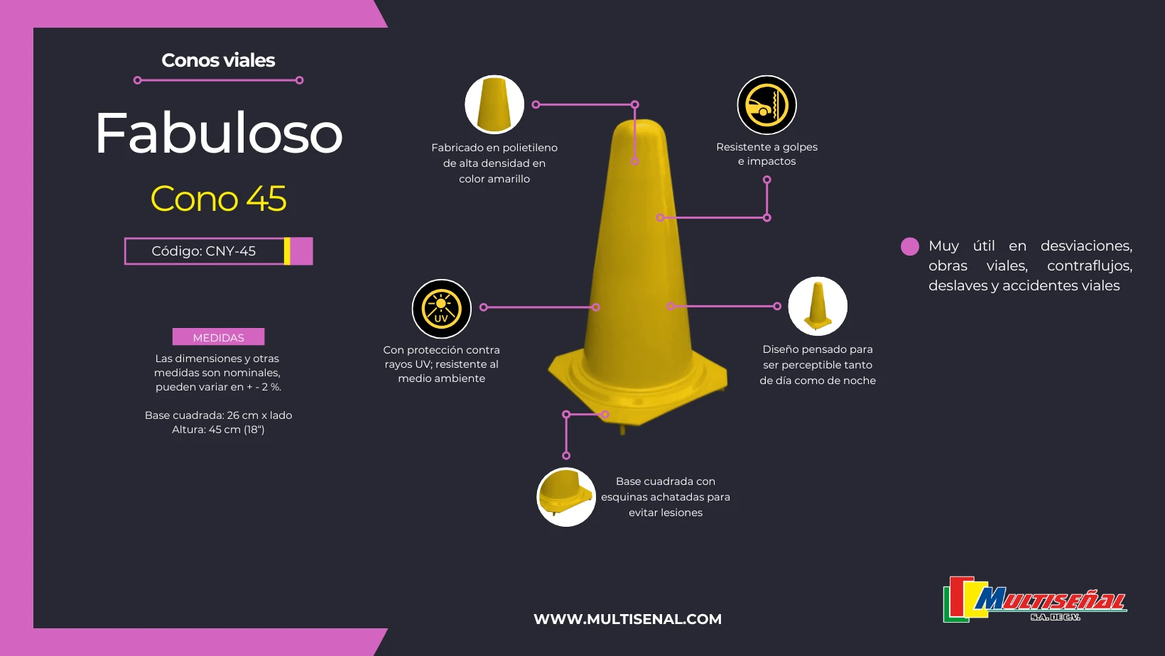 Estos conos semi-flexibles no solo destacan por su resistencia a impactos, sino que también son fabricados en una sola pieza, con una base cuadrangular de esquinas redondeadas que proporciona estabilidad.
