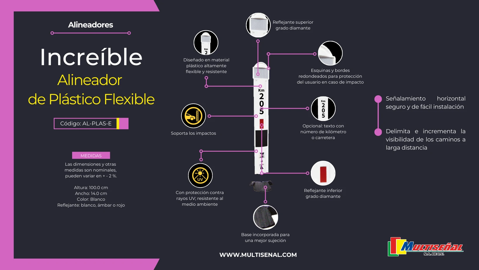 Disfruta de la innovación que ilumina tu camino y protege a cada conductor en su travesía nocturna. Y conoce nuestros diferentes alineadores como los fantasmas viales. Cotiza con un asesor de ventas en nuestro WhatsApp.