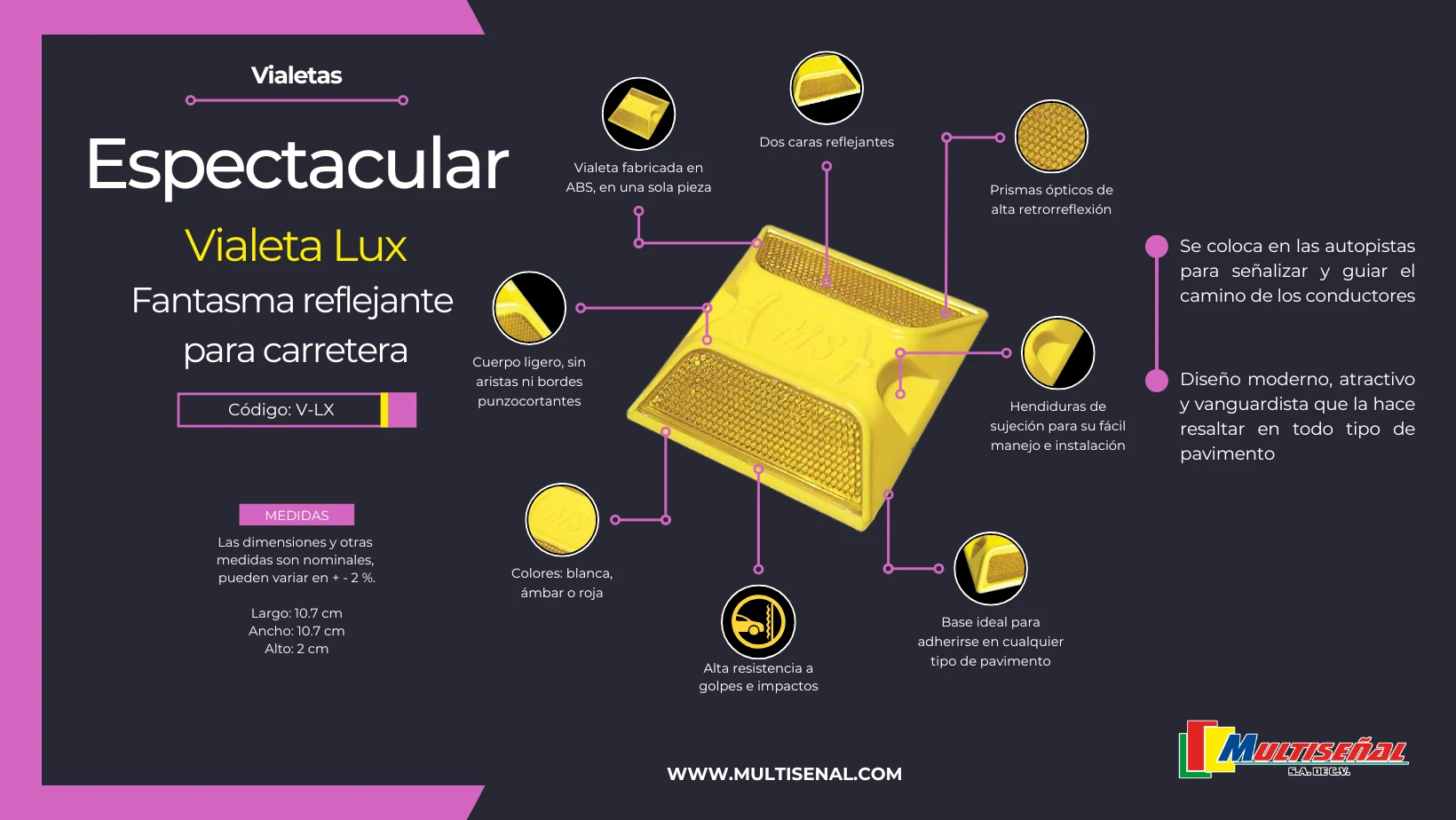- La vialeta reflejante presenta una composición basada en prismas ópticos de alta reflexión, asegurando una visibilidad excepcional durante la noche, incluso en condiciones climáticas extremas.