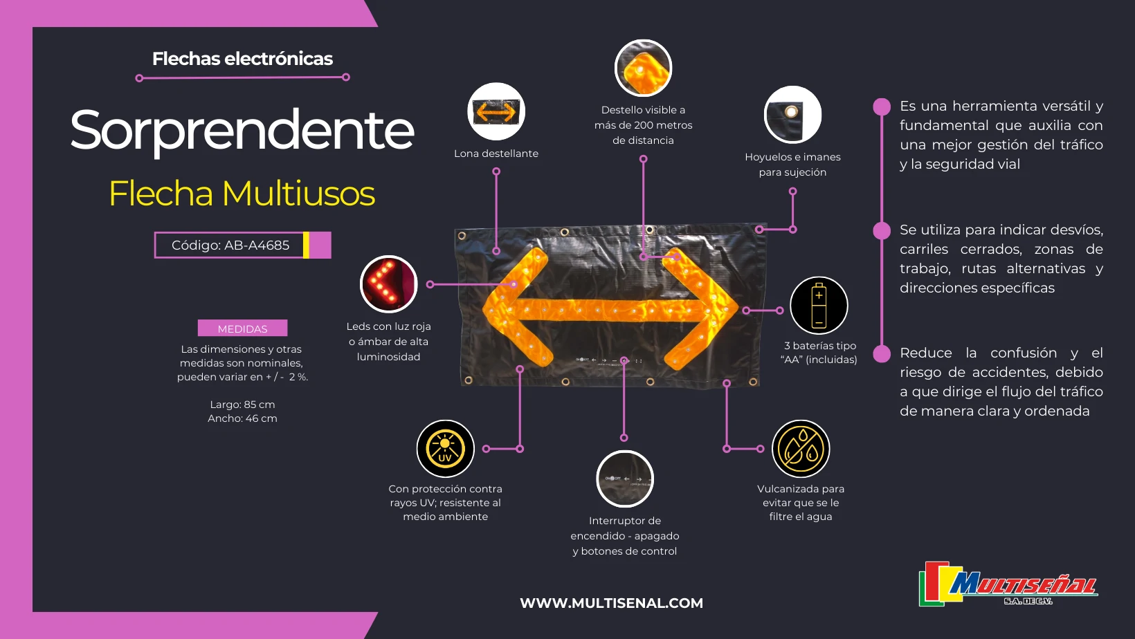 La flecha multiusos es un dispositivo de señalización vial que se utiliza para una variedad de propósitos, como advertir a los conductores de peligros, indicar el sentido de circulación o dirigir el tráfico.