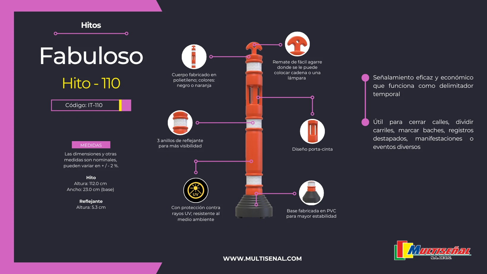 Ya sea para canalizar vías, señalizar obras viales, desviaciones o simplemente delimitar zonas de estacionamiento, el hito-110 se alza como la elección inteligente para proyectos que requieren eficiencia y confiabilidad. Con su diseño innovador y características sobresalientes, este hito vial redefine los estándares de señalización, ofreciendo una solución integral que cumple con las demandas más exigentes de tus proyectos.