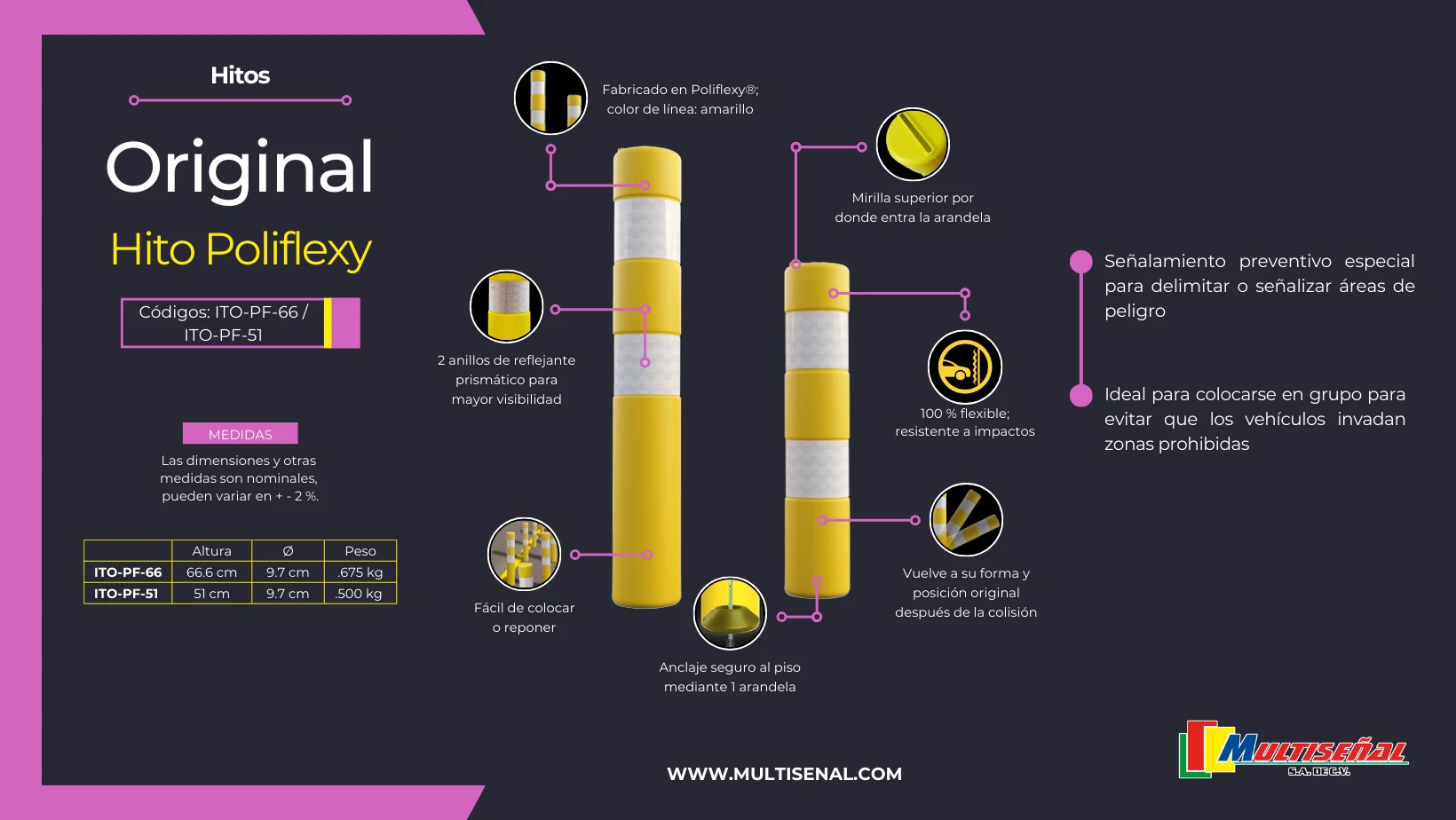 Los hito poliflexy 51 son elementos esenciales en la señalización vial, diseñados para ofrecer una marcada prevención y seguridad en áreas de potencial riesgo. Su utilidad radica en su capacidad para delimitar zonas peligrosas, así como para señalizar áreas de alineamiento, mejorando la percepción visual de los conductores y peatones.