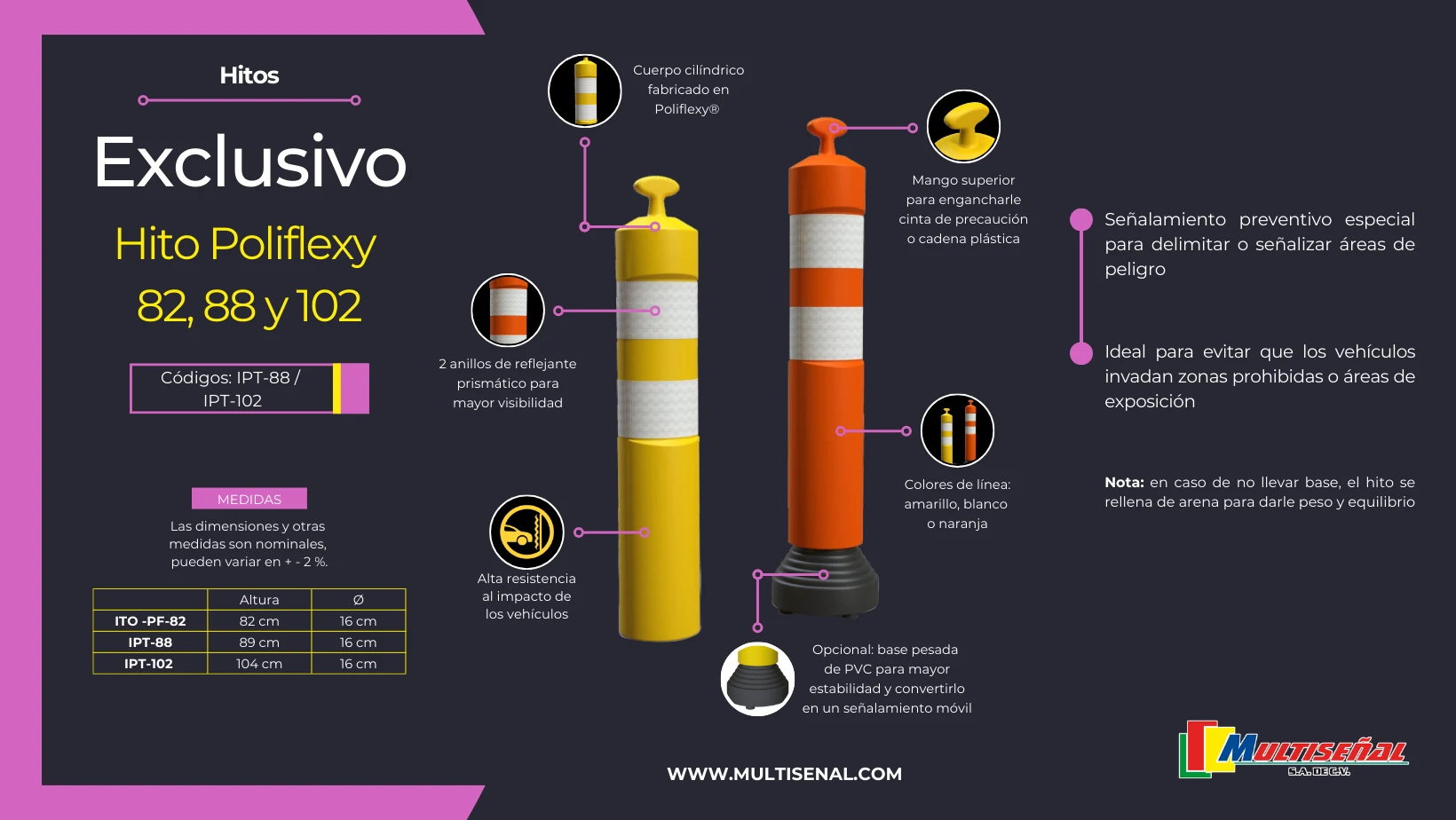 El Hito poliflexy 88, creado con un material plástico altamente flexible y resistente, ofrece la mejor visibilidad y precaución ante los obstáculos en las calles o carreteras.