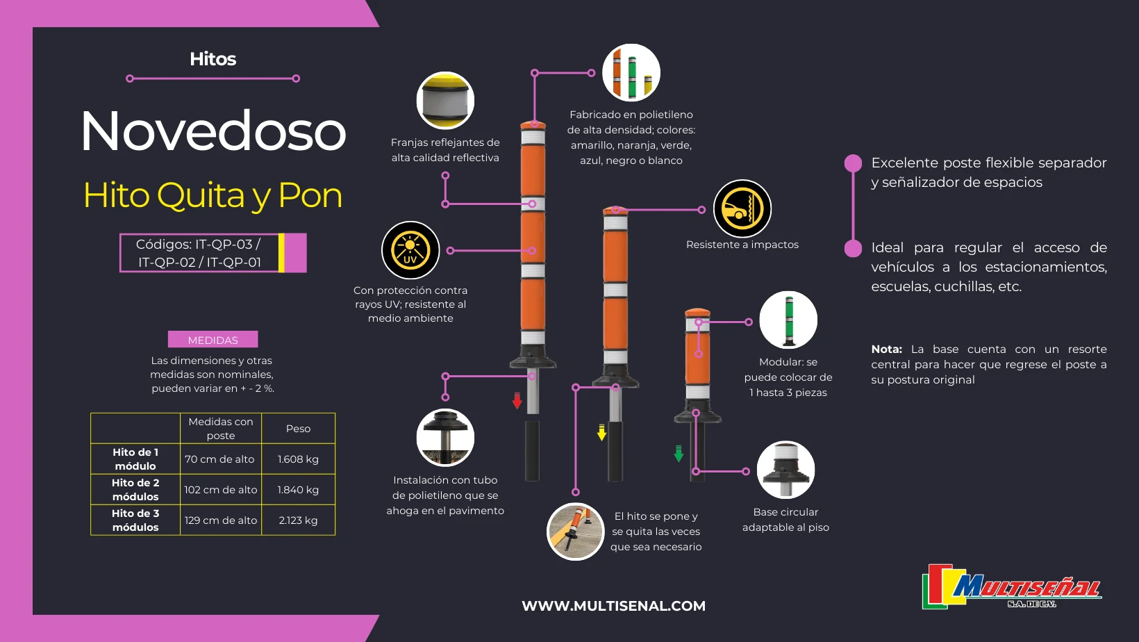 No olvides conocer más de nuestros productos de señalización como el hito quita y pón mediano. Vale la pena destacar que nosotros mismos fabricamos y distribuimos estos productos, asegurando un control total sobre su calidad y disponibilidad.