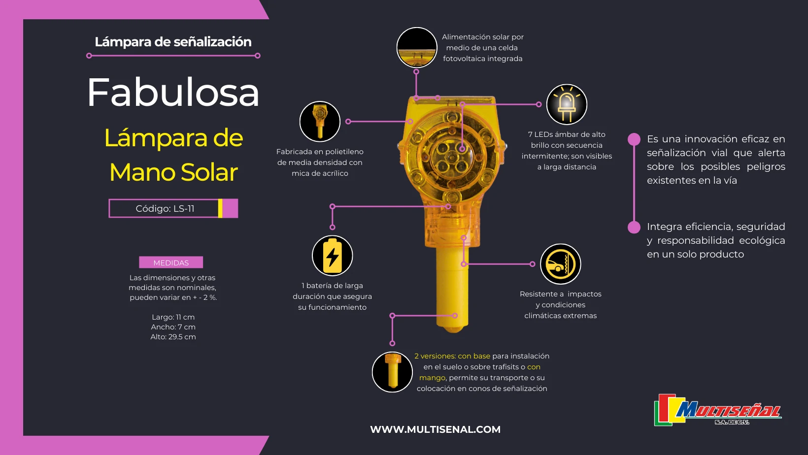 Equipada con 7 LEDs ámbar de ultra brillo, su secuencia intermitente garantiza visibilidad a distancias notables, mejorando la seguridad en entornos viales.