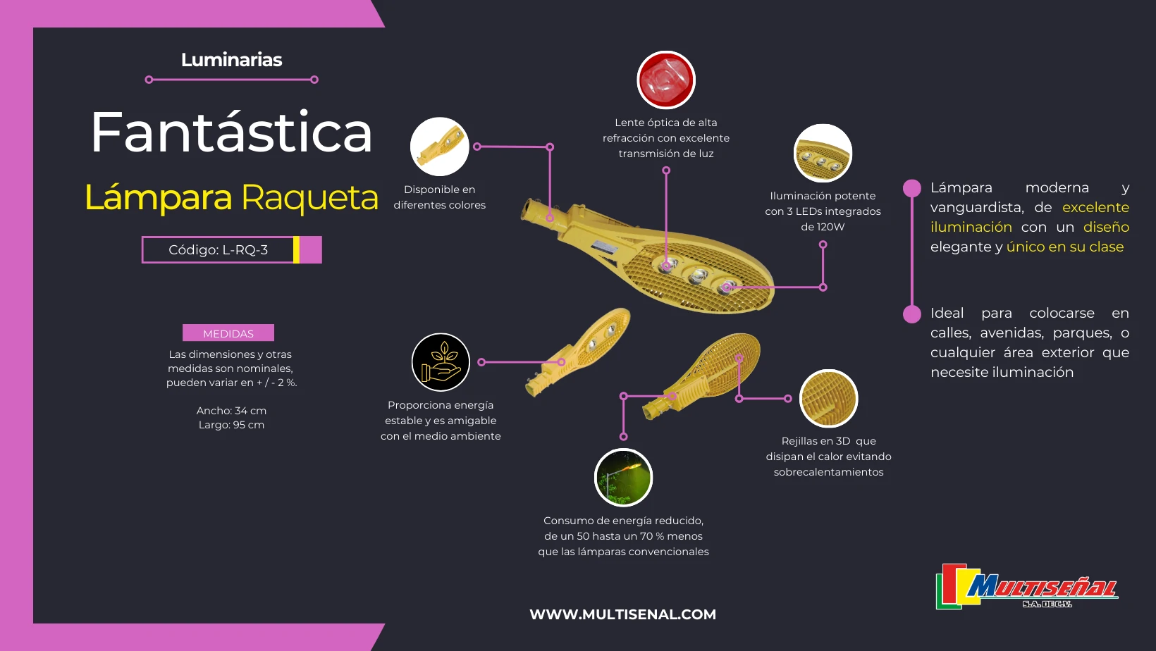 Experimenta la revolución en iluminación urbana con nuestra lámpara tipo raqueta, diseñada para destacar en eficiencia y estilo. Con un avanzado diseño en 3D en las rejillas de ventilación en forma de poliedro, se logra un efecto de ventilación cruzada único, evitando calentamientos indeseados.