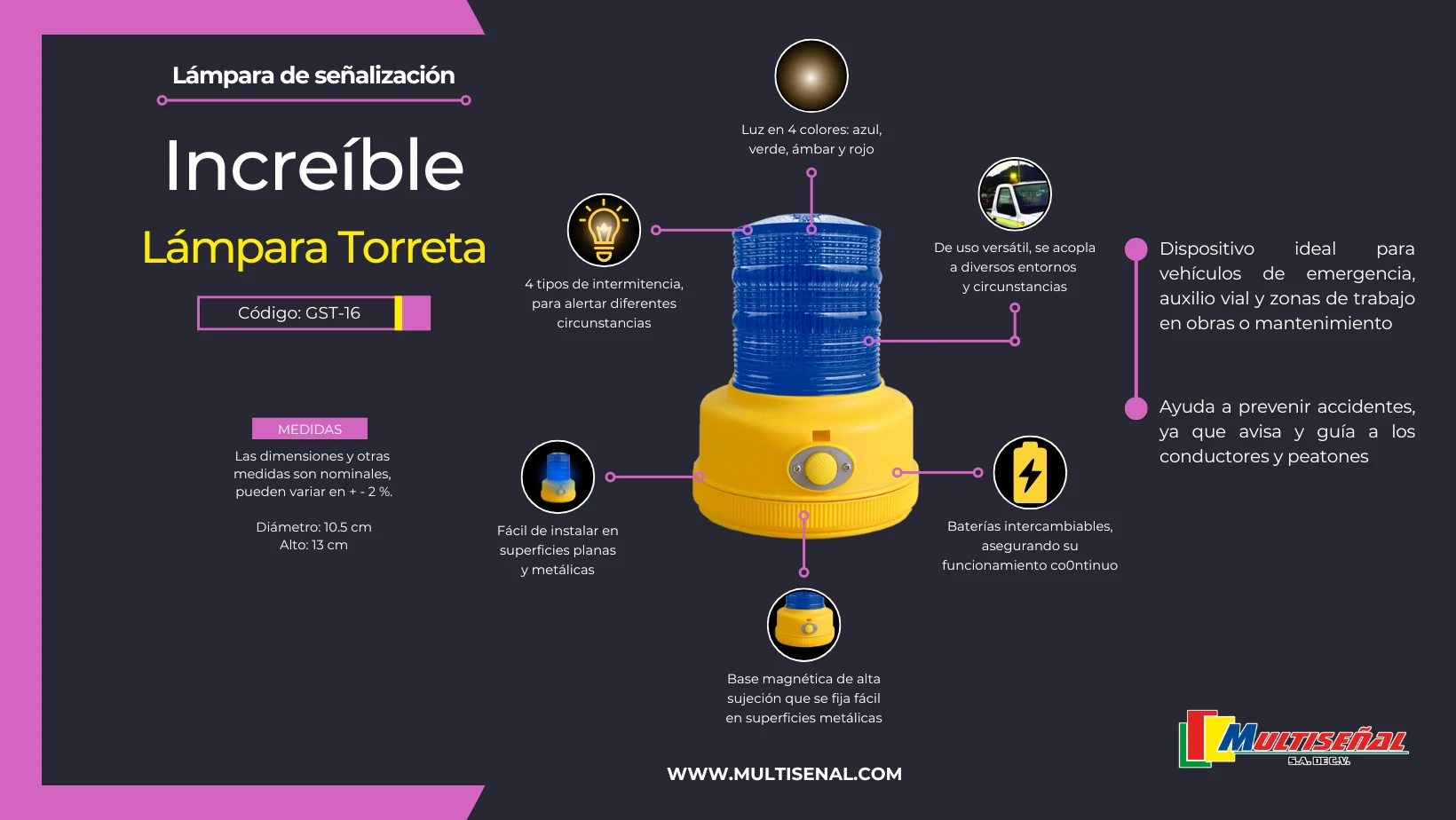 Al incorporar la lámpara torreta en tus operaciones viales, aseguras una visibilidad y prevención confiable, adaptable y eficiente.