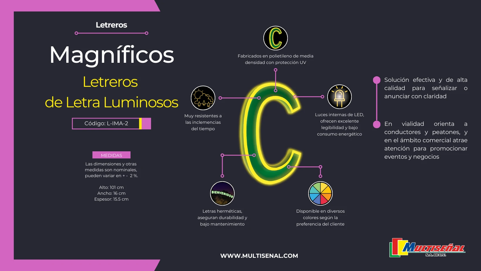 Experimenta la excelencia en señalización urbana y publicitaria con nuestros letreros de letra luminosos. Perfectos para marcar el inicio o fin de municipios y ciudades, así como para destacar grandes negocios, plazas comerciales u oficinas. Estos letreros son más que simples caracteres; son símbolos brillantes que capturan la atención con su iluminación LED de vanguardia.